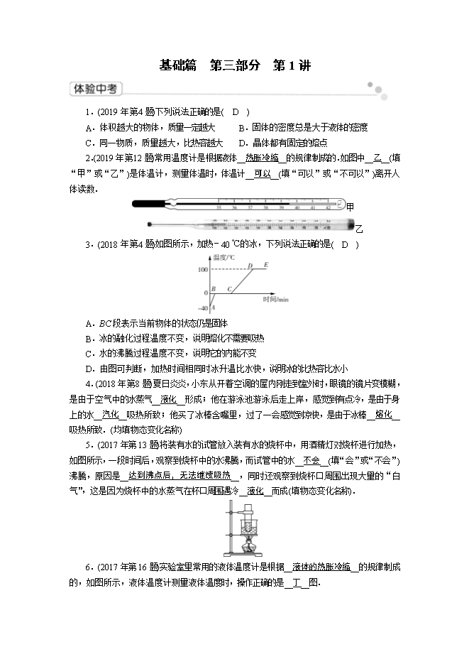 【内容简介】1.如图所示用温度计测量烧杯中液体的温度,做法正确的是( D ) 2.下列物态变化中,属于汽化现象的是( B )A.春天,冰雪消融 B.夏天,洒在地板上的水很快干了C.秋天,清晨草地上出现了霜 D.冬天,湖面的水结成冰3.如图所示,用水壶烧水,水烧开后能看到壶嘴周围有“白气”产生,其中a、b两位置有一处“白气”较浓.以下关于“白气”的描述正确的是( C ) A.它是水蒸气,a处较浓 B.它是水蒸气,b处较浓C.它是小水滴,a处较浓 D.它是小水滴,b处较浓【解析】因为a处离壶嘴较远,温度相对b点较低,液化产生的小水珠更多,所以a处“白气”较浓.4.(2019年贵港模拟)下列对自然现象中发生的物态变化及吸、放热情况的分析,正确的是( B )A.雪的形成是凝固现象,放热 B.露的形成是液化现象,放热C.霜的形成是凝华现象,吸热 D.雾的形成是汽化现象,吸热5.(2019年珠海模拟)如图所示,固态、液态和气态是物质常见的三种状态,某物质通过放热、吸热在甲、乙、丙三种物态之间转化.下列说法正确的是( D ) A.甲为固态,由甲到乙是升华过程B.乙为液态,由乙到丙是凝固过程C.丙为液态,由乙到丙是液化过程D.丙为固态,由丙到甲是熔化过程6.(2019年长沙卷)“二十四节气”是中华民族智慧的结晶,有关节气的谚语,下列分析正确的是( C )A.“惊蛰云不停,寒到五月中”,云的形成是升华现象.......