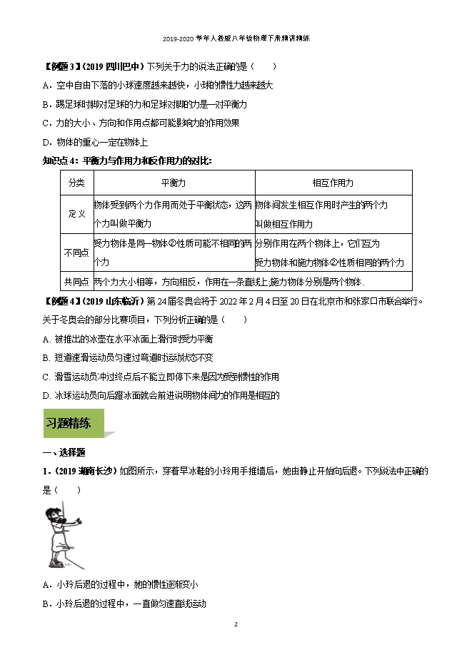 【精品】2019-2020学年人教版八年级物理下册精讲精练:8.2 二力平衡(原卷版和解析版)