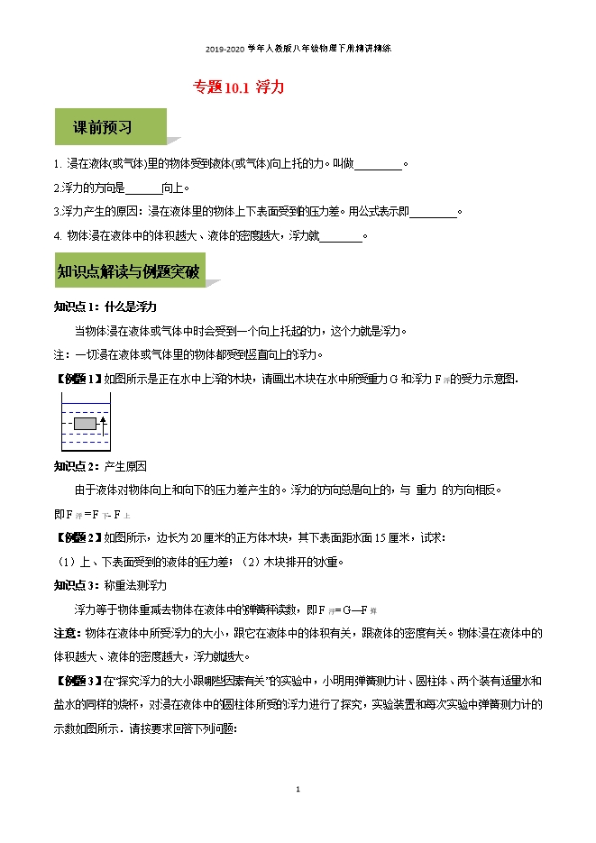 【内容简介】1. 浸在液体(或气体)里的物体受到液体(或气体)向上托的力。叫做_____浮力____。2.浮力的方向是___竖直____向上。3.浮力产生的原因:浸在液体里的物体上下表面受到的压力差。用公式表示即______ F浮=F下- F上____。4. 物体浸在液体中的体积越大、液体的密度越大,浮力就____越大____。 知识点1:什么是浮力当物体浸在液体或气体中时会受到一个向上托起的力,这个力就是浮力。注:一切浸在液体或气体里的物体都受到竖直向上的浮力。【例题1】如图所示是正在水中上浮的木块,请画出木块在水中所受重力G和浮力F浮的受力示意图. 【答案】如图所示: 【解析】因为物体在水中,所以受浮力和重力的关系,浮力方向竖直向上,重力方向竖直向下;又物体上浮,所以物体受到的浮力大于重力,作用点都画在重心处. 知识点2:产生原因由于液体对物体向上和向下的压力差产生的。浮力的方向总是向上的,与 重力 的方向相反。即F浮=F下- F上【例题2】如图所示,边长为20厘米的正方体木块,其下表面距水面15厘米,试求:(1)上、下表面受到的液体的压力差;(2)木块排开的水重。【答案】见解析。【解析】已知: ρ液=1.0×103kg/m3,g=9.8N/kg,h上=0m,h下=0.15m,S 上=S 下=0.04 m2,V 排=0.2m×0.2m×0.15m=0.006 m3求:(1)F上-F下 (2)G排解:(1)F上=P下S下= ρgh下S下=58.8NF下=P上S上= ρgh上S上=0NF上-F下=58.8N (2)G排=ρg V 排=58.8N 可见,部分浸入液体的物体所受的浮力,也等于液体对物体向上的压力和向下的压力之差。知识点3:称重法测浮力浮力等于物体重减去物体在液体中的弹簧秤读数,即F浮= G—F弹 注意:物体在液体中所受浮力的大小,跟它在液体中的体积有关,跟液体的密度有关。物体浸在液体中的体积越大、液体的密度越大,浮力就越大。