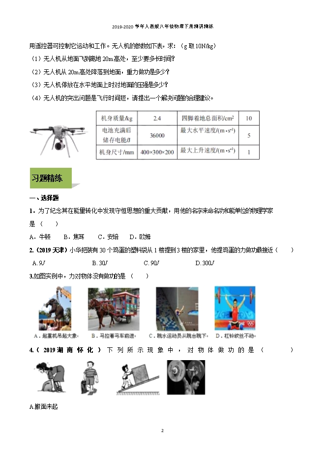 【内容简介】1.在物理学中,把力和在力的方向上移动的____距离____的乘积叫做功。2.做功的两个必要因素:一是有___力___作用在物体上,二是物体在力的方向上移动一段距离。3.功计算公式:___W=Fs____.4.功单位是焦尔,用符号____ J____,1J=1N•m。 知识点1:力学中的功1.如果一个力作用在物体上,物体在力的方向上移动了一段距离,这个力的作用就显示出成效,力学里就说这个力做了功。2.功的两个因素:一个是作用在物体上的力 ,另一个是在力的方向上移动的距离。3.不做功的三种情况:①物体受到了力,但静止。②物体由于惯性运动通过了距离,但不受力。③物体受力的方向与运动的方向相互垂直,这个力也不做功。【例题1】关于功的说法正确的是( )A.小明用力推发生故障的汽车而未推动时,推力对汽车做了功B.吊车吊着重物沿水平匀速运动一段距离时,吊车的拉力对重物做了功C.足球在水平地面上滚动一段距离时,重力对足球做了功D.举重运动员从地面将杠铃举起的过程中,举重运动员对杠铃做了功【答案】D【解析】A.小明用力推发生故障的汽车而未推动时,推力对汽车做了功,错误,有力的作用,没有沿力的方向移动距离,没有做功;B.吊车吊着重物沿水平匀速运动一段距离时,吊车的拉力对重物做了功,错误,有力的作用,没有沿力的方向移动距离,没有做功;C.足球在水平地面上滚动一段距离时,重力对足球做了功,错误,错误,有力的作用,没有沿力的方向移动距离,没有做功;D.举重运动员从地面将杠铃举起的过程中,举重运动员对杠铃做了功,正确。......