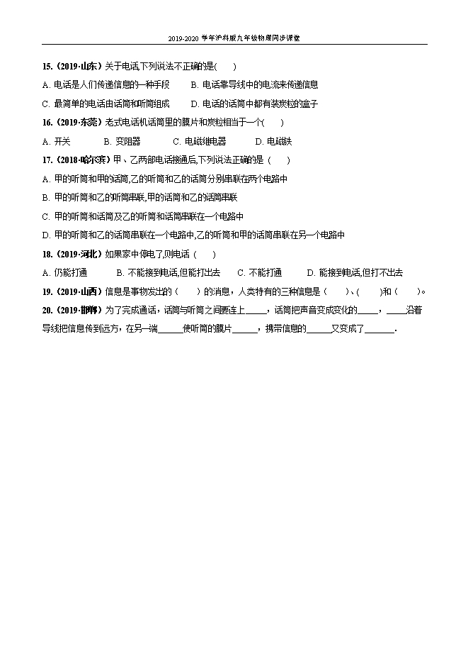 - 780【精品】2019-2020学年沪科版九年级物理同步课堂:第19章 走进信息时代(单元总结 单元测试)