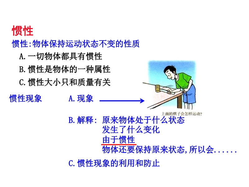 【内容简介】1. 牛顿第一定律: 一切物体在没有受到外力作用的时候,总保持 匀速直线运动状态或静止状态.A.牛顿第一定律由实验+科学推理得出(理想实验法)B.当物体不受外力时:原来静止的物体—保持静止 原来运动的物体—保持匀速直线运动B.当物体不受外力时:原来静止的物体—保持静止 原来运动的物体—保持匀速直线运动惯性:物体保持运动状态不变的性质A.一切物体都具有惯性B.惯性是物体的一种属性C.惯性大小只和质量有关(1)合力与分力:如果一个力产生的作用跟几个力共同作用产生的效果相同,这个力就叫做那几个力的合力。组成合力的每一个力叫分力。(2)力的合成:如果已知几个力的大小和方向,求合力的大小和方向,称为力的合成。 同一直线上的二力合成:①两个力同方向时:其合力方向不变,大小是这两个力的大小之和。即:F合=F1+F2②两个力方向相反时:合力方向与其中较大的力方向一致,大小是这两个力的大小之差。即:F合=F1-F2。