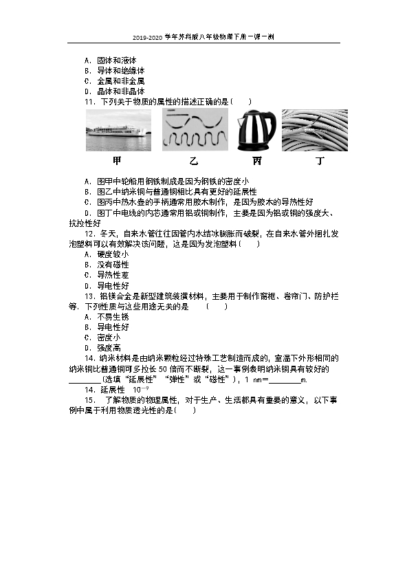 - 886.5 物质的物理属性(基础练)-2020-2021学年八年级物理下册十分钟同步课堂专练(苏科版)