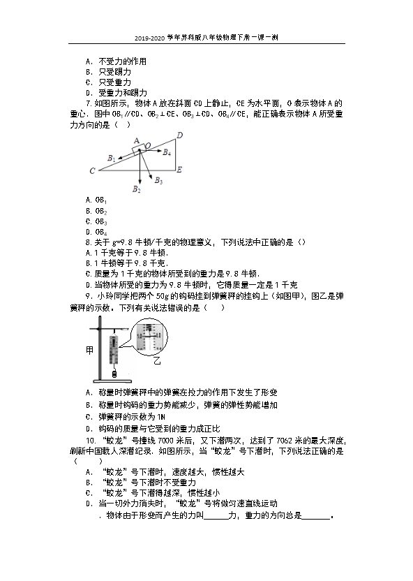 2019-2020学年苏科版八年级物理下册一课一测:8.2重力 力的示意图(附答案版)