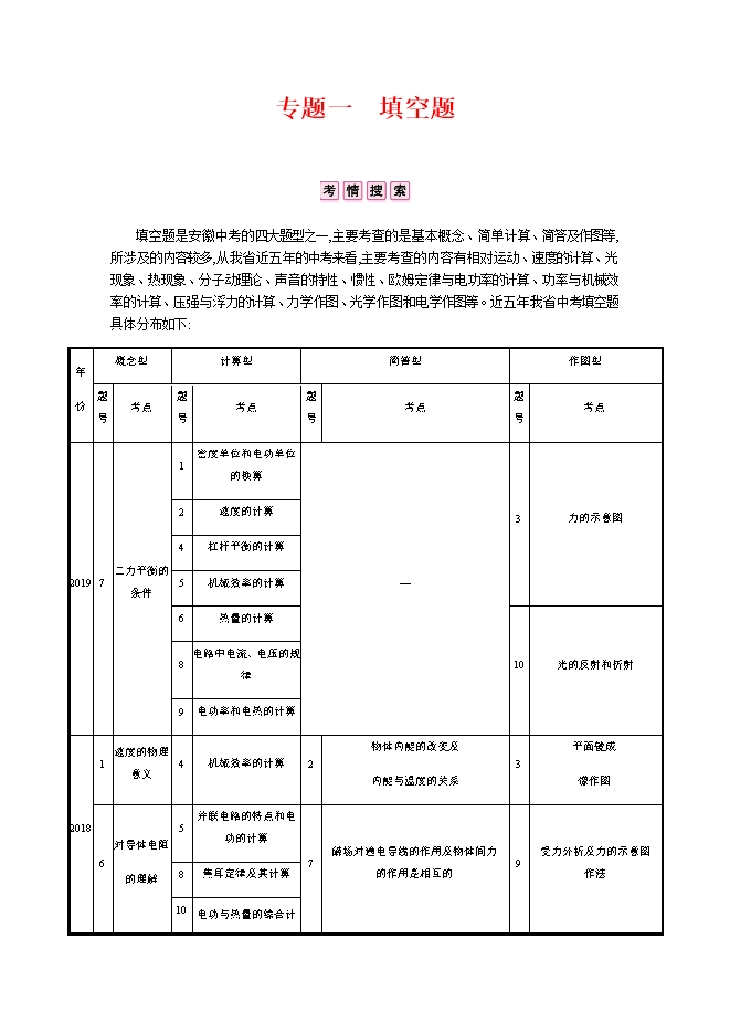 【内容简介】分析上表可以看出安徽中考题的填空题考查的知识点很多,几乎覆盖了所有的知识,从各类型的题量来看计算型有4~7题占较大比例,概念型有1~3题,简答型有1~2题,作图型有1~2题。从年份上看近三年计算型和作图型在填空题中考查的量大,也有一定的难度。类型一 概念型填空 ( ☞学用见P115 ) 内容关键点声音的特征区分音调、响度与音色,以识记和理解为主物态变化区分熔化、凝固、汽化、液化、凝华与升华,以识记和理解为主力和运动识记与理解电与磁区分电动机与发电机的结构及原理,以识记和理解为主 1.( 2019•江西 )音调、响度、音色是声音的三个主要特征。演奏二胡时,手指上下移动按压琴弦的不同位置,可改变二胡发声的 音调 特征;其下方有一个共鸣箱,可用来增大二胡发声的 响度 特征。 2.如图所示是小明用拖把拖地的情景,此时拖把属于 费力 ( 选填“省力”“费力”或“等臂” )杠杆,平时用力拖地,是通过 增大压力 的方法来增大摩擦,可使地面更干净。 3.( 2019•广西桂林 )小陆在照镜子时,为了能从镜子中看清自己的脸部。他走近镜子去看,靠近时,他的脸部在平面镜中所成像的大小 不变 ( 选填“变大”“变小”或“不变” ),平面镜所成的像是 虚像 ( 选填“实像”或“虚像” )。 4.在透明塑料袋中滴入几滴酒精,将袋挤瘪,排尽袋中空气后把口扎紧,然后放入80 ℃以上的热水中,一段时间过后,塑料袋鼓起,这是因为塑料袋里的酒精 汽化 ( 填物态变化名称 )的缘故。 5.( 2019•黑龙江齐齐哈尔 )如图所示是四冲程汽油机内部剖面图,汽油机工作过程中, 做功 冲程可以使汽车获得动力。汽油机工作时会产生大量热,需要用水进行降温,是利用水的 比热容 大的特性。 .......