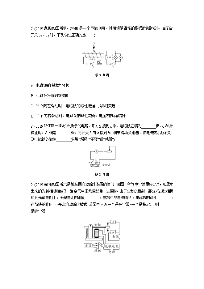 【内容简介】命题点1 磁学基本知识及安培定则类型1 磁现象 磁场1. (2019聊城)关于磁场和磁感线,以下说法错误的是( )A. 磁体周围存在着磁感线B. 磁体之间的相互作用是通过磁场产生的C. 磁体外部的磁感线都是从磁体的N极出发,回到S极的D. 磁场中,小磁针静止时北极所指的方向为该点磁场的方向2. (2019江西)如图所示,是利用被磁化的缝衣针制成的简易指南针.若静止时针尖指向地理位置的北方,则针尖是简易指南针的______极.此时,将指南针底座逆时针旋转90°,针尖静止时将指向地理位置的______方. 第2题图类型2 电磁现象的辨识3. (2019攀枝花)电磁感应广泛应用于我们的日常生活中,下列哪种设备应用了电磁感应原理( ) 4. (2019梧州)如图所示是奥斯特实验的示意图,下列分析正确的是( ) 第4题图A. 通电导线产生的磁场对小磁针有力的作用B. 通电导线周围的磁场方向与电流方向无关C. 移去小磁针后的通电导线周围不存在磁场D. 小磁针的指向决定了通电导线周围磁场的方向5. (2019阳江市三模)无线充电技术应用了特斯拉线圈,如图所示,用一不通电的LED灯靠近正在通电的特斯拉线圈时,LED灯发光了,灯被点亮的现象可以用我们学过的哪一知识来解析( ) 第5题图A. 电流的磁效应 B. 磁场对电流的作用 C. 安培定则 D. 电磁感应类型3 安培定则及其应用 电磁继电器..........