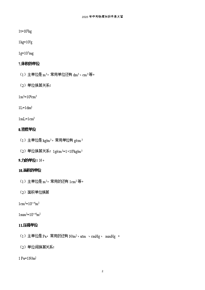 【通用版】2020年中考物理知识手册大全:专题3 物理量单位及其换算