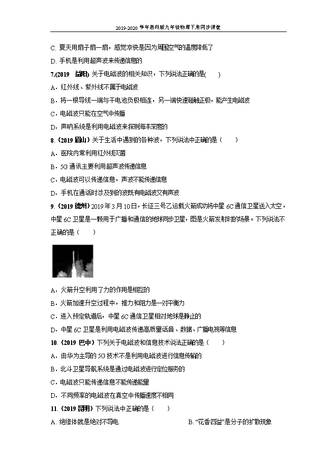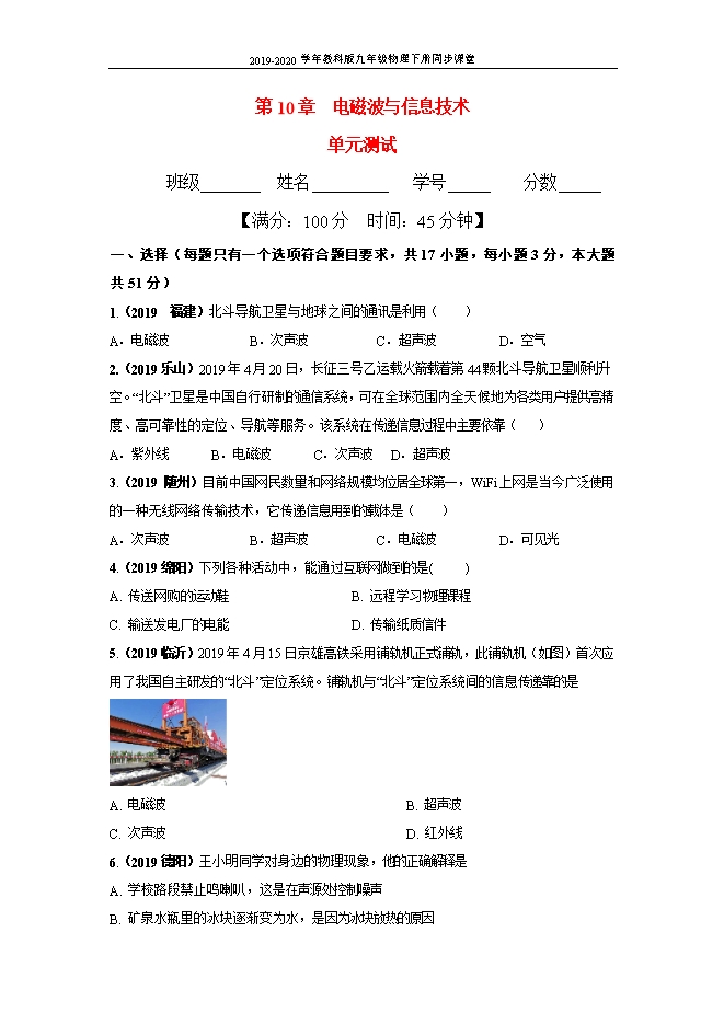 - 10392019-2020学年教科版九年级物理同步单元AB卷:第10章 电磁波与信息技术(A卷基础篇)