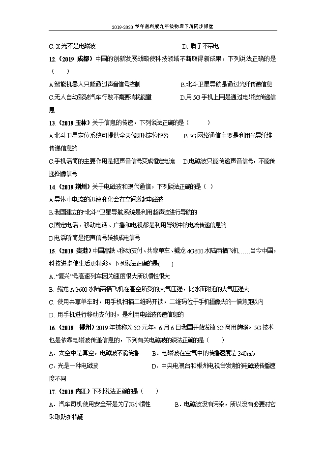 【内容简介】知识要点一:电磁波及其应用 1.产生:导体中的电流迅速变化时,导体周围就会产生电磁波。2. 传播:电磁波可以在真空中传播,不需要任何介质。3电磁波的特征:(1)波长:相邻的两个波峰(波谷)的距离。符号λ,单位是米(m) (2)波速:电磁波的传播速度,单位是m/s。波速的大小跟介质有关,跟波长、频率无关。对于同种介质而言,电磁波的波速是定值。比如真空电磁波的速度始终等于光速,即C=3x108m/s。 (3)频率:波源一秒内振动的次数叫做频率。用字母ƒ表示,单位是Hz。在真空中的电磁波,当波长越小,频率越高;波长越大,频率越低。4.不同频率的电磁波特点不同,有不同的应用:(1)医疗上利用γ射线做外科手术;利用X射线判断身体某些部位是否异常。(2)通信上利用微波及无线电波来传送信息,无线电波更是广泛应用于广播、电视、移动通信、导航雷达等、微波通信、卫星通信、光纤通信、网络通信都是以电磁波为传递信息的载体。作为载体的无线电波,频率越高,在相同时间内传输的信息就越多。(3)生活中的空调、电视机遥控器用的是红外线;微波炉用的是微波;我们看东西是因为可见光。 (2019荆州)关于电磁波和现代通信,下列说法正确的是( )A.导体中电流的迅速变化会在空间激起电磁波B.我国建立的“北斗”卫星导航系统是利用超声波进行导航的C.固定电话、移动电话、广播和电视都是利用导线中的电流传递信息的D.电话听筒是把声信号转换成电信号..........