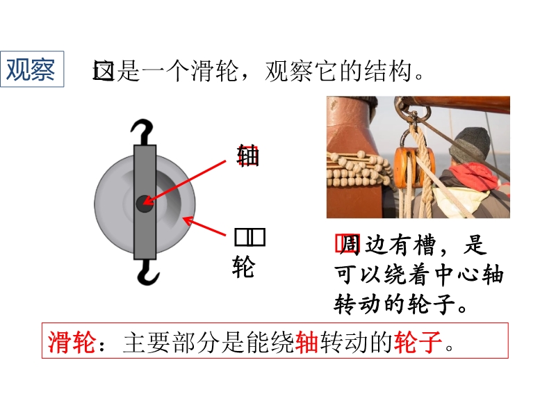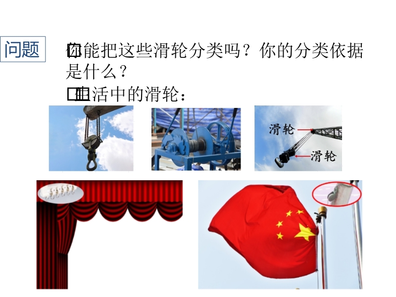 【内容简介】周边有槽,是可以绕着中心轴转动的轮子。滑轮:主要部分是能绕轴转动的轮子。你能把这些滑轮分类吗?你的分类依据是什么?两种滑轮国旗上升时,旗杆顶端的滑轮不随物体一起移动。货物上升时,电动机下面的滑轮随物体一起移动。大人利用滑轮将重物吊到二楼,孩子想帮忙,却把自己吊了上去。想想看,为什么会出现这样的笑话?你能解释其中的道理吗?定滑轮的特点。进行实验:1. 用弹簧测力计测出钩码所受的重力 G。2. 用定滑轮把钩码匀速提升,读出测力计的示数 F、重物移动距离 h、测力计移动的距离 s,用箭头标出重物移动的方向、拉力的方向。使用定滑轮不省力,不省距离;但可以改变力的方向。使用动滑轮可以省力吗?使用动滑轮可以省距离吗?使用动滑轮可以改变力的方向吗?.......
