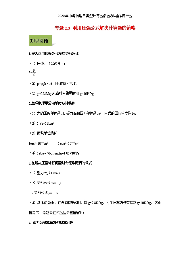 【内容简介】1.灵活运用压强公式及其变形公式(1)压强:(普遍使用)P= (2)p=ρgh(适用于液体、气体)(3)g=9.8N/kg或者特殊说明时取g=10N/kg2.掌握物理量常用单位及其换算(1)力的国际单位是N, 受力面积国际单位是m2,压强的国际单位是Pa。(2)1 Pa=1N/m2(3)面积单位换算1cm2=10—4m2 1mm2=10—6m2(4)1atm = 760mmHg=1.01×105Pa3.在解决压强计算问题时会经常用到的公式(1)重力公式G=mg(2)变形公式m=G/g(3) 变形公式g=G/m(4)具体问题中,在没有特殊说明,取g=9.8N/kg;为了计算方便常常取g=10N/kg,这种情况下,命题者在试题里会直接给出。4. 重力公式能解决的基本问题重力公式G=mg涉及三个物理量,一个是常量,所以知道一个可以求解另一个。比如:已知物体的质量,可以求重力。已知物体的重力,可以求出质量。也可以根据本公式,结合密度公式求解物体体积等物理量。5.利用压强公式解决计算题时思维方法A.对压强公式P= 的理解(1)压力F的大小不一定等于重力,方向也不一定是竖直向下。压力与物体表面垂直;(2)受力面积S是指物体相互挤压的面积,与物体表面积不一定相等,可以等于或小于物体表面积,但绝对不会大于物体的表面积。(3)在理解了压力和受力面积之后,运用压强公式计算时,F的单位是牛顿(N),受力面积S的单位要用平方米(m2),这样得到物体所受压强P的单位是帕(Pa)。(4)在讨论压力作用效果时,应该用控制变量法来分析,即当压力F一定时,压强P与受力面积成反比;当受力面积一定时,压强P与压力成正比。如果在增大压力F的同时,减小受力面积,那么物体受到的压强是增大的;在减小压力和同时增大受力面积时,压强是减小的,对后面两点希望大家也要有清醒的认识。(5)压强公式P=F/S既适用与固体,又适用与液体,也适用与气体。B.利用液体压强公式求解问题时应重点关注的地方:(1)应用的公式是P=ρgh;(2)g=9.8N/kg有时题中为了计算简单给出g=10N/kg(3)ρ是指产生压强的液体的密度,一般给出,但对常见的液体水,其密度需记忆。ρ水=1.0×103kg/m3(4)h是指深度,表示从自由液面到计算压强的那点之间的竖直距离,即深度是由上往下量的。对以上问题理解后,各量单位统一了,代入公式计算能很好地解决实际问题。.....