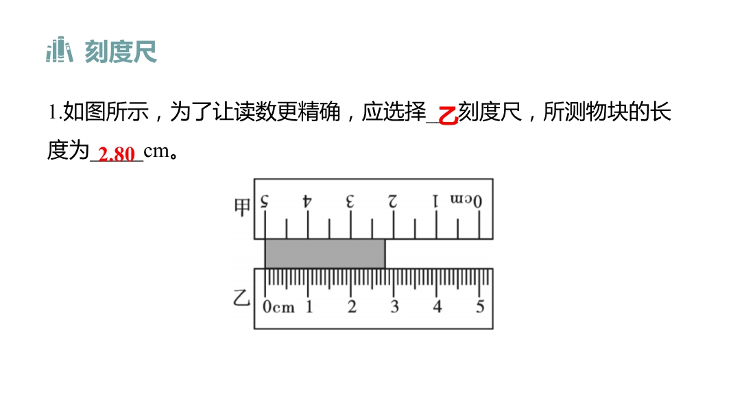 【内容简介】1.如图所示,为了让读数更精确,应选择___刻度尺,所测物块的长度为_____cm。【解析】甲刻度尺,1cm之间有2个小格,其分度值为0.5cm,乙刻度尺,1cm之间有10个小格,其分度值为1mm,使用乙刻度尺测量较精确;其分度值为1mm;物块左侧与0刻度线对齐,右侧与2.8cm对齐,估读为2.80cm,所以物块的长度为2.80cm。2.清晨,王爷爷绕小区花园步行锻炼身体,借助秒表测量了自己步行一圈的时间为2min24s,如图所示,秒表外圈示数的单位为___,分度值为____s。3.一弹簧测力计如图所示,其刻度____(选填“是”或“不是”)均匀的,量程为_____N,分度值为____N,示数为____N。4.如图甲所示,电阻箱的示数为______Ω;如图乙所示,电流表的示数为____A,电压表的示数为____V。.......