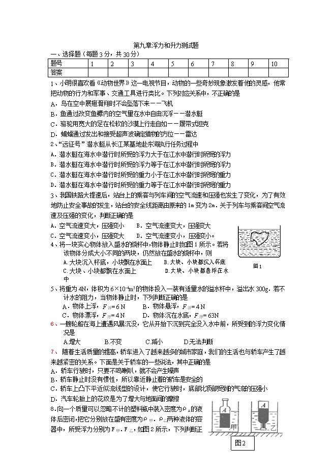沪粤版八年级物理《第九章 浮力与升力》测试题及答案