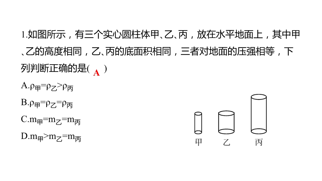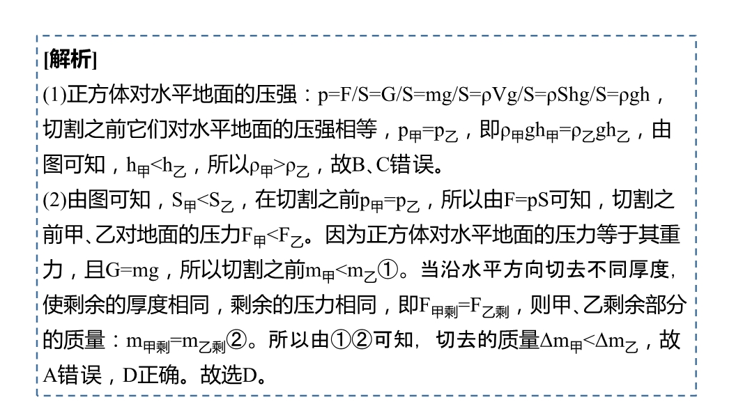 【内容简介】1.如图所示,有三个实心圆柱体甲、乙、丙,放在水平地面上,其中甲、乙的高度相同,乙、丙的底面积相同,三者对地面的压强相等,下列判断正确的是( )A.ρ甲=ρ乙;ρ丙B.ρ甲=ρ乙=ρ丙C.m甲=m乙=m丙D.m甲;m乙=m丙[解析](1)因为甲、乙、丙都是实心圆柱体,所以对水平地面的压强:p=F/S=G/S=mg/S=ρVg/S=ρShg/S=ρgh;由图可知,甲、乙、丙的高度h甲=h乙;h丙,且三者对地面的压强相等,所以由p=ρgh可知,三圆柱体的密度关系:ρ甲=ρ乙;ρ丙,故A正确,B错误;(2)由图可知,甲、乙的底面积S甲;S乙,高度h甲=h乙,所以V甲;V乙,因为ρ甲=ρ乙,又因为m=ρV,所以甲、乙圆柱体的质量关系:m甲;m乙;已知乙、丙的底面积S乙=S丙,对地面的压强相等,则由p=F/S=G/S=mg/S可知,乙、丙圆柱体的质量关系:m乙=m丙,所以三圆柱体的质量关系:m甲;m乙=m丙,故C、D错误。故选A。2.两个正方体甲、乙放在水平地面上,它们对水平地面的压强相等,沿水平方向切去不同厚度,使剩余的厚度相同,剩余的压力相同,则甲、乙切去的质量Δm甲、Δm乙和甲、乙的密度ρ甲、ρ乙满足的关系是( )A.ρ甲;ρ乙Δm甲;Δm乙B.ρ甲;ρ乙Δm甲;Δm乙C.ρ甲;ρ乙Δm甲;Δm乙D.ρ甲;ρ乙Δm甲;Δm乙[解析](1)正方体对水平地面的压强:p=F/S=G/S=mg/S=ρVg/S=ρShg/S=ρgh,切割之前它们对水平地面的压强相等,p甲=p乙,即ρ甲gh甲=ρ乙gh乙,由图可知,h甲;h乙,所以ρ甲;ρ乙,故B、C错误。(2)由图可知,S甲;S乙,在切割之前p甲=p乙,所以由=pS可知,切割之前甲、乙对地面的压力F甲;F乙。因为正方体对水平地面的压力等于其重力,且G=mg,所以切割之前m甲;m乙①。当沿水平方向切去不同厚度,使剩余的厚度相同,剩余的压力相同,即F甲剩=F乙剩,则甲、乙剩余部分的质量:m甲剩=m乙剩②。所以由①②可知,切去的质量Δm甲;Δm乙,故A错误,D正确。故选D。