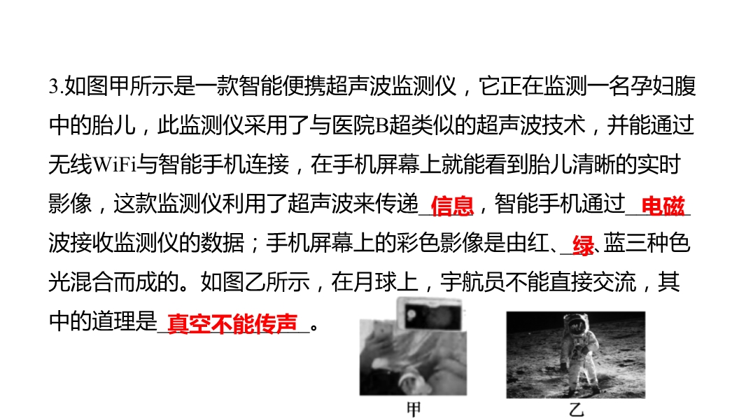 【内容简介】1.人站在北京天坛回音壁圆形围墙内附近说话,声音经过多次_____,可在围墙的任何位置听到。编钟是我国春秋战国时代的乐器,敲击大小不同的钟能发出不同的_____(选填“音调”“响度”或“音色”,下两空同),用大小不同的力敲击同一口钟能发出不同的_____。我们能听出老师的手机铃声是汪峰唱的《飞得更高》,这是根据声音的_____来辨别的。2.诗句“姑苏城外寒山寺,夜半钟声到客船”中,钟声是钟______产生的,钟声是通过_____传播到人耳中的;当声音从空气进入水中传播时,声速____(选填“会”或“不会”)发生变化。3.如图甲所示是一款智能便携超声波监测仪,它正在监测一名孕妇腹中的胎儿,此监测仪采用了与医院B超类似的超声波技术,并能通过无线WiFi与智能手机连接,在手机屏幕上就能看到胎儿清晰的实时影像,这款监测仪利用了超声波来传递_____,智能手机通过______波接收监测仪的数据;手机屏幕上的彩色影像是由红、___、蓝三种色光混合而成的。如图乙所示,在月球上,宇航员不能直接交流,其中的道理是______________。.....
