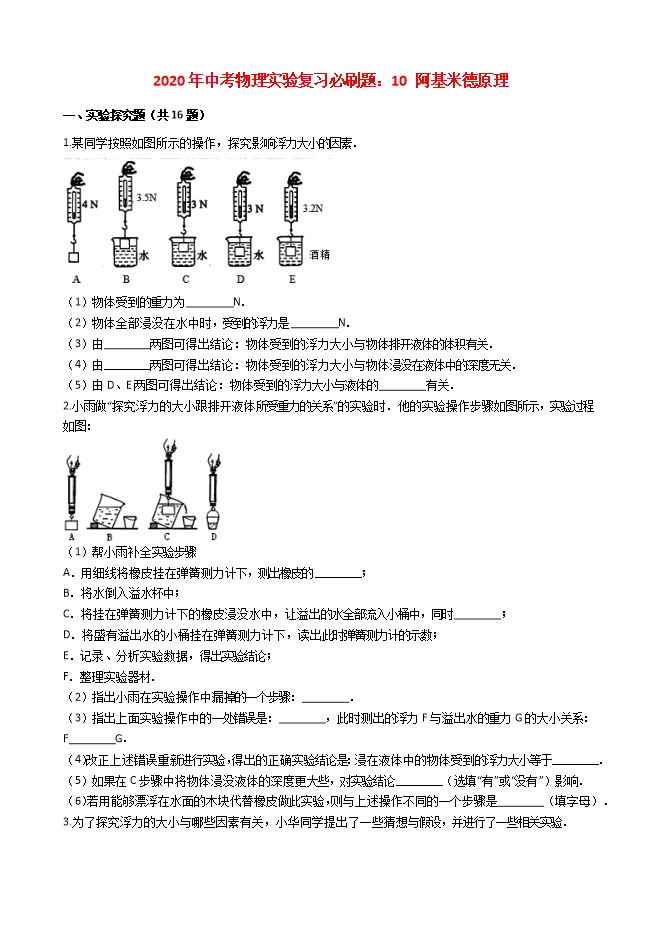 2020年中考物理实验复习必刷题:10 阿基米德原理(附解析)
