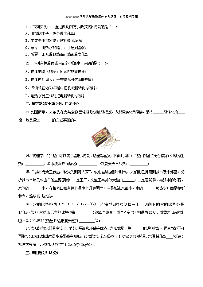 2019-2020学年九年级物理分章考点讲、析与提高专题:13.内能(单元提升检测卷)(人教版)
