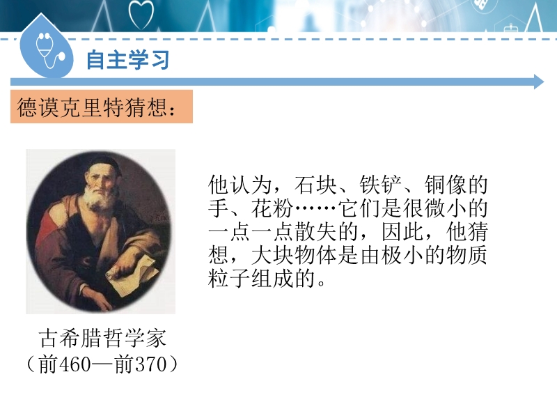 【内容简介】核心考点什么是分子、分子的大小。自主学习走进花园,为什么很远就能闻到花香?德谟克里特猜想:他认为,石块、铁铲、铜像的手、花粉……它们是很微小的一点一点散失的,因此,他猜想,大块物体是由极小的物质粒子组成的。1.自然界中存在着能保持物质 性质不变的最小微粒,叫做 。2.我们常见的物体,都是由 组成的。3.大多数分子直径的尺度,其数量级为 m,即 nm。课堂导学在“用油膜法测分子的大小”的实验中,如果测得体积为V的一滴油在水面上散开形成单分子油膜的面积为S,则这种油分子的直径为 。测量结果表明分子直径的数量级一般为 m。.......