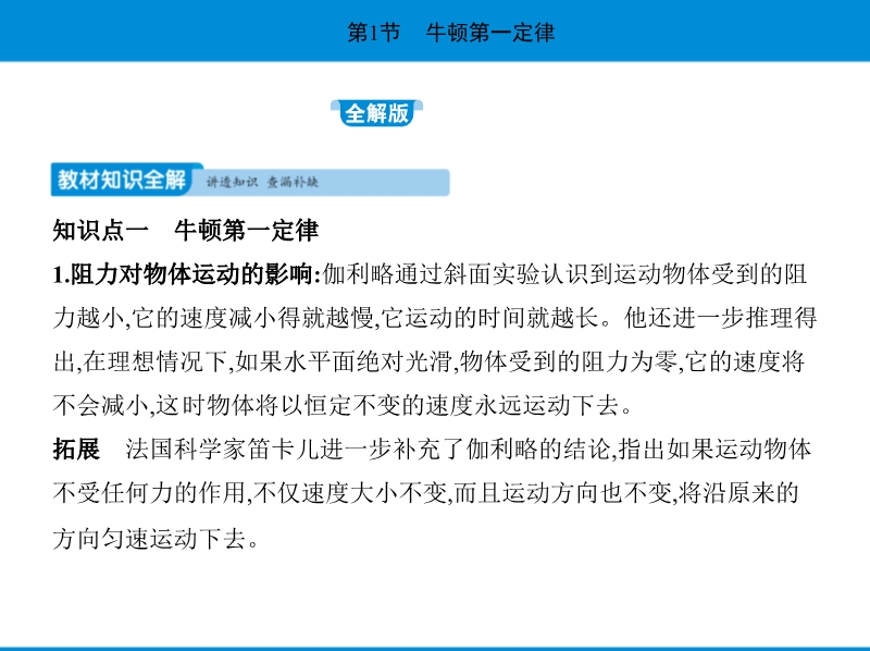 【内容简介】知识点一 牛顿第一定律1.阻力对物体运动的影响:伽利略通过斜面实验认识到运动物体受到的阻力越小,它的速度减小得就越慢,它运动的时间就越长。他还进一步推理得出,在理想情况下,如果水平面绝对光滑,物体受到的阻力为零,它的速度将不会减小,这时物体将以恒定不变的速度永远运动下去。拓展 法国科学家笛卡儿进一步补充了伽利略的结论,指出如果运动物体不受任何力的作用,不仅速度大小不变,而且运动方向也不变,将沿原来的方向匀速运动下去。2.牛顿第一定律(1)牛顿第一定律的内容一切物体在没有受到力的作用时,总保持静止状态或匀速直线运动状态。(2)牛顿第一定律的理解①“一切物体”是牛顿第一定律的适用对象;②“没有受到力的作用”是此定律的适用条件;③不受力时,原来静止的物体会保持静止状态,原来运动的物体会保持运动状态。“或”说明两种状态只能保持一种。(3)关于牛顿第一定律的三点说明①牛顿第一定律不是实验定律,而是在大量经验事实的基础上,通过进一步推理而概括出来的。②牛顿第一定律表明,力不是维持物体运动的原因,而是改变物体运动状态的原因,即:物体不受力,运动状态不改变;物体运动状态改变必定受力。.......