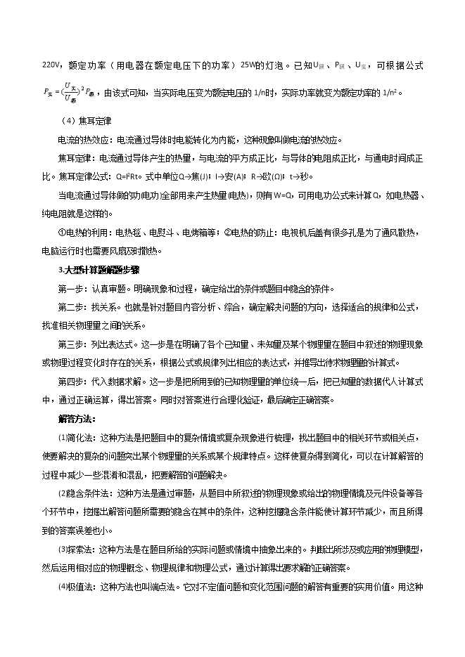 【内容简介】★命题诠释1.大型计算题大型计算题俗称压轴题,是中考试卷主要题型,也是必考题型,同时也是产生差距,判断考生综合应用能力、题型难度属于中等偏上的题型。大型计算题在中考试卷中占有很大比例,一般情况下所占比例在25%左右。大型计算题以考查学生综合应用所学知识分析问题和解决问题的能力为主,它既能反映学生对基本知识的理解掌握水平,同时又能体现学生在综合应用所学知识分析和解决问题过程中的情感、态度与价值观。解答计算题应该首先明确它的特点,避免盲目和无从下手的尴尬,同时明确题目涉及的物理现象和物理知识,明确要解决的问题是什么,找准关系,有的放矢的按要求进行合理的计算。2.特点大型计算题要求有计算过程和步骤,每一步骤都有相应分值。大型计算题的特点是:(1)结果合理性:这类题能反映学生对自然界或生产、生活中若干事物的观察和关心程度.它要求学生用生活实践,社会活动的基本经验对题目的计算结果进行判断,留取合理的,舍弃不合理的。(2)知识综合性:这类题往往是把几个或几种物理过程及物理现象放在一起,利用各个过程或各种现象之间的相切点,解答要解决的问题。它反映学生学习知识的综合能力和分析解决问题的能力。(3)应用性:这类题是把物理知识浸透到社会实际操作和应用到生活体验中,它能够反映学生对所学物理知识的理解和情感,同时也能反映学生对自己生活中的一些实际操作的认识水平。★题型解密1.电学大型计算题主要内容电学大型计算主要涉及到欧姆定律及应用、电功与电功率、电热相关计算等。大型计算题很少是单一知识点或考点的计算,常见的是多个考点的综合计算,但其计算内容不变。2.考前速记(1)欧姆定律:导体中的电流与导体两端的电压成正比,与导体的电阻成反比。公式: ,其中:U为电源电压,单位为伏(V);I为通过导体的电流,单位为安(A);R为导体的电阻,单位为欧(Ω)。注意:应用欧姆定律的公式进行计算时,一定要统一到国际制单位后再进行计算。欧姆定律公式中的各个物理量具有同一性,即I,U,R是对同一段导体、同一时刻而言的。.........