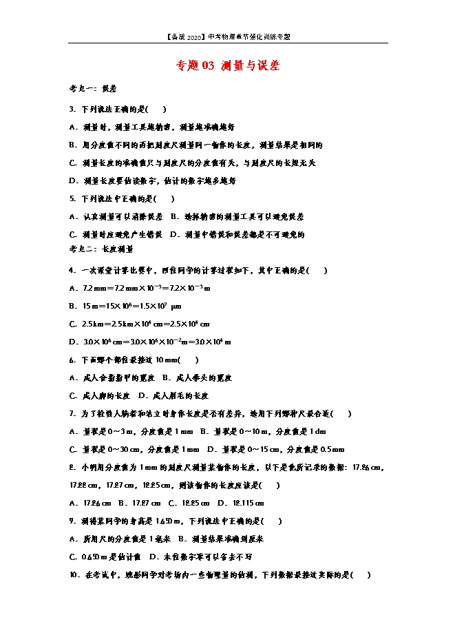 【备战2020】中考物理章节强化训练专题:03 测量与误差(附解析)