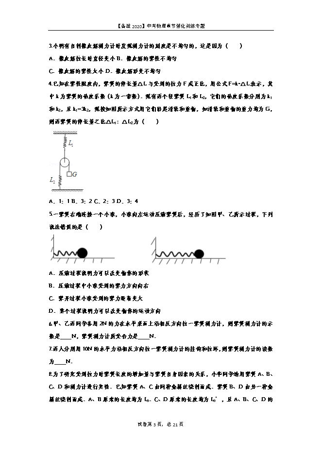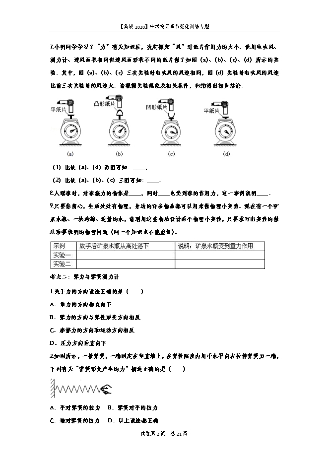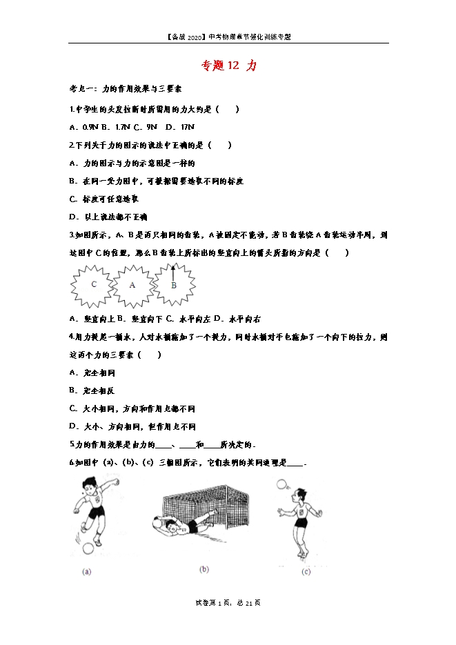 【内容简介】考点一:力的作用效果与三要素1.中学生的头发拉断时所需用的力大约是( )A.0.9NB.1.7NC.9ND.17N2.下列关于力的图示的说法中正确的是( )A.力的图示与力的示意图是一样的B.在同一受力图中,可根据需要选取不同的标度C.标度可任意选取D.以上说法都不正确3.如图所示,A、B是两只相同的齿轮,A被固定不能动,若B齿轮绕A齿轮运动半周,到达图中C的位置,那么B齿轮上所标出的竖直向上的箭头所指的方向是( ) A.竖直向上B.竖直向下C.水平向左D.水平向右4.用力提起一桶水,人对水桶施加了一个提力,同时水桶对手也施加了一个向下的拉力,则这两个力的三要素( )A.完全相同B.完全相反C.大小相同,方向和作用点都不同D.大小、方向相同,但作用点不同5.力的作用效果是由力的 、 和 所决定的.6.如图中(a)、(b)、(c)三幅图所示,它们表明的共同道理是 . 7.小明同学学习了“力”有关知识后,决定探究“风”对纸片作用力的大小.他用电吹风、测力计、迎风面积相同但迎风面形状不同的纸片做了如图(a)、(b)、(c)、(d)所示的实验.其中,图(a)、(b)、(c)三次实验时电吹风的风速相同,图(d)实验时电吹风的风速比前三次实验时的风速大.请根据实验现象及相关条件,归纳得出初步结论. (1)比较(a)、(d)两图可知: ;(2)比较(a)、(b)、(c)三图可知: .8.人踢球时,对球施力的物体是 ,同时 也受到球的作用力,这一事例说明 .9.只要你留心,生活处处有物理,身边的许多物品都可以用来做物理小实验.现在有一个矿泉水瓶、一块海绵、适量的水,请利用这些物品设计两个物理小实验,只要求写出实验的做法和要说明的物理问题(同一个知识点不能重复)........