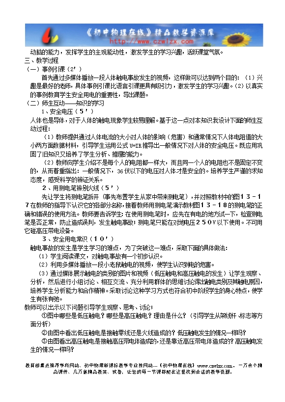 首先通过多媒体播放一段人体触电事故发生的视频,这样做可以达到两个目的:(1)兴趣是最好的老师,具体事例引课比语言引课更具有吸引力,激发学生的学习兴趣。(2)以真实的事例教育学生安全用电的重要性,导出课题。