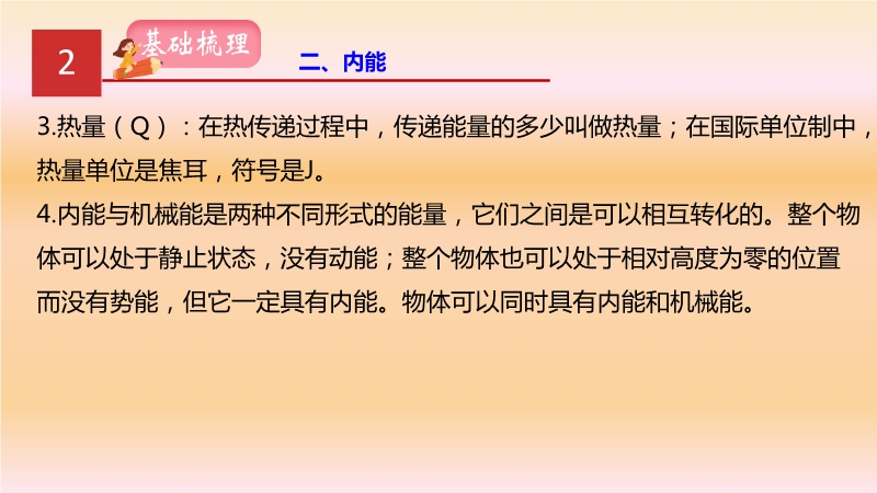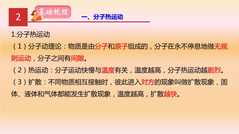 【内容简介】一、分子热运动1.分子热运动(1)分子动理论:物质是由分子和原子组成的,分子在永不停息地做无规则运动,分子之间有间隙。(2)热运动:分子运动快慢与温度有关,温度越高,分子热运动越剧烈。(3)扩散:不同物质相互接触时,彼此进入对方的现象叫做扩散现象,固体、液体和气体都能发生扩散现象,温度越高,扩散越快。2.分子间作用力分子间相互作用的引力和斥力是同时存在的。当固体被压缩时,分子间距离变小,分子作用力表现为斥力;当固体被拉伸时,分子间距离变大,作用力表现为引力。如果分子间距离很大,作用力几乎为零,可以忽略不计;因此,气体具有流动性,也容易被压缩。液体间分子之间距离比气体小,比固体大,液体分子之间的作用力比固体小,没有固定的形状,具有流动性。二、内能1.内能:物体内部所有分子热运动的分子动能与分子势能的总和,叫做物体的内能。(1)分子动能:分子在永不停息地做着无规则的热运动。物体内大量分子做无规则热运动所具有的能量称为分子动能。物体的温度越高,分子运动得越快,它们的动能越大。同一个物体(物态不变),温度越高,内能越大。(2)由于分子之间具有一定的距离,也具有一定的作用力,因而分子具有势能,称为分子势能。分子间距发生变化时,物体的体积也会变,其内能会发生变化。所以分子势能与物体的体积有关。(3)物体内能的大小:物体的内能与物体的质量、温度、体积及物态有关。一切物体中的分子都在做永不停息的做无规则运动,分子间都有分子力的作用,无论物体处于何种状态,是何形状与体积、温度是高是低都是如此。因此,一切物体在任何情况下都具有内能。.......