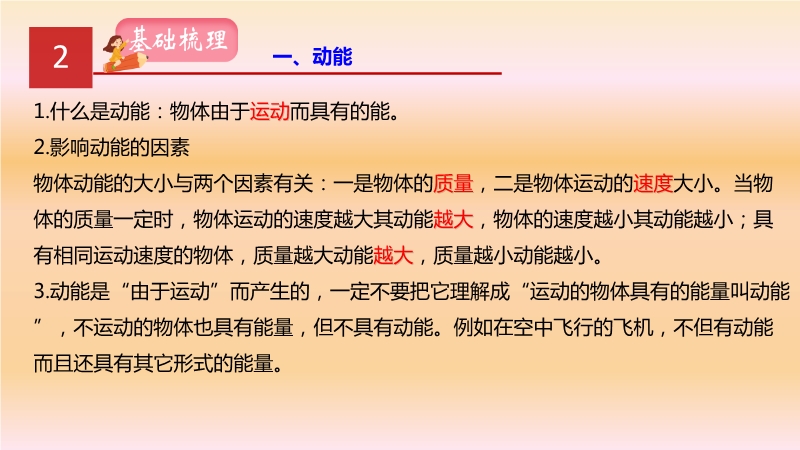 【内容简介】一、动能1.什么是动能:物体由于运动而具有的能。2.影响动能的因素物体动能的大小与两个因素有关:一是物体的质量,二是物体运动的速度大小。当物体的质量一定时,物体运动的速度越大其动能越大,物体的速度越小其动能越小;具有相同运动速度的物体,质量越大动能越大,质量越小动能越小。3.动能是“由于运动”而产生的,一定不要把它理解成“运动的物体具有的能量叫动能”,不运动的物体也具有能量,但不具有动能。例如在空中飞行的飞机,不但有动能而且还具有其它形式的能量。二、势能1.重力势能:物体由于被举高而具有的能量,叫做重力势能。(1)重力势能的大小与质量和高度有关。物体的质量越大,被举得越高,则它的重力势能越大。(2)重力势能是“被举高”这个原因而产生的,一定不要把它理解成“被举高的物体具有的能量叫重力势能”,被举高的物体具有重力势能,同时也具有其他形式能量。例如在空中飞行的飞机,不但有重力势能而且还具有其它形式的能量。2.弹性势能:物体由于发生弹性形变,而具有的能叫做弹性势能。撑杆跳高时弯曲的杆、拉开的弓箭都具有弹性势能。弹性势能的大小与弹性形变的程度有关;形变程度越大,其弹性势能越大。.........