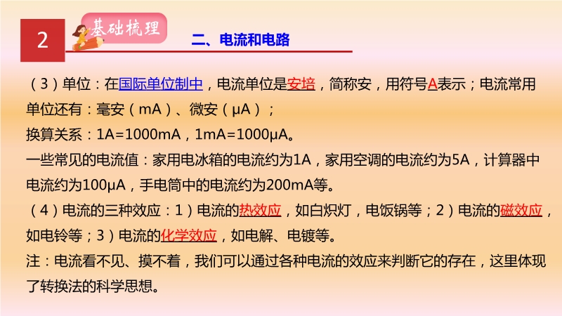 【内容简介】一:电荷1.物体带电:摩擦过的物体吸引轻小物体的性质,我们就说物体带电。带电物体(带电体)的基本性质:吸引轻小物体(轻小物体指:碎纸屑、头发、通草球、灰尘、轻质球等)。2.使物体带电的方法①摩擦起电:用摩擦的方法使物体带电叫摩擦起电。原因:不同物质原子核束缚电子的本领不同。实质:电荷从一个物体转移到另一个物体使正负电荷分开;能的转化:机械能→电能。②接触带电:物体和带电体接触后带了电。如带电体与验电器金属球接触使之带电。③感应带电:由于带电体的作用,使带电体附近的物体带电。3.两种电荷:(1)正电荷:用丝绸摩擦过的玻璃棒所带的电;实质:物质中的原子失去了电子。(2)负电荷:用毛皮摩擦过的橡胶棒所带的电;实质:物质中的原子得到了多余的电子。4.电荷间的相互作用:同种电荷相互排斥,异种电荷相互吸引。5.验电器:(1)构造:金属球、金属杆、金属箔。如图所示。(2)作用:检验物体是否带电和物体带电多少(带电多,金属箔张开角度大)。(3)原理:同种电荷相互排斥。6.电荷量:电荷的多少叫电荷量,简称电量;在国际单位制中,电量单位是库仑,简称为库,符号是C。元电荷(e): 在各种带电微粒中,电子电量的大小是最小的,人们把最小电荷叫做元电荷;元电荷也是物理学的基本常数之一,常用符号e表示。基本电荷e=1.6021892×10-19库仑,是一个电子或一个质子所带的电荷量,任何带电体所带电荷都是e的整数倍。7.中和:放在一起的等量异种电荷完全抵消的现象。扩展:①如果物体所带正、负电量不等,也会发生中和现象。这时,带电量多的物体先用部分电荷和带电量少的物体中和,剩余的电荷可使两物体带同种电荷。②中和不是意味着等量正负电荷被消灭,实际上电荷总量保持不变,只是等量的正负电荷使物体整体显不出电性。8.导体:善于导电的物体。常见材料:金属、石墨(铅笔芯)、人体、大地、酸碱盐溶液、含杂质的水。导电原因:导体中有大量可以自由移动的电荷。说明:金属导体中电流是自由电子定向移动形成......