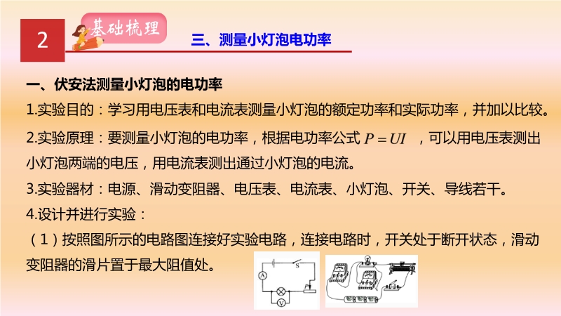 【内容简介】一、电能与电功1.电功:电流通过某段电路所做的功叫电功。2.电流做功的实质:电流做功过程,实际就是电能转化为其他形式的能(消耗电能)的过程;电流做多少功,就有多少电能转化为其他形式的能,也就消耗了多少电能。3.电流做功的形式:电流通过各种用电器使其转动、发热、发光、发声等都是电流做功的表现。4.规定电流在某段电路上所做的功,等于这段电路两端的电压,电路中的电流和通电时间的乘积。5.电功公式:W=IUt=Pt(适用于所有电路)。二、电功率1.电功率:电流在单位时间内所做的功。2.电功率物理意义:表示电流做功快慢的物理量。3.电功率公式: (适用于所有电路),推导公式: (适用于纯电阻电路)。三、测量小灯泡电功率一、伏安法测量小灯泡的电功率1.实验目的:学习用电压表和电流表测量小灯泡的额定功率和实际功率,并加以比较。2.实验原理:要测量小灯泡的电功率,根据电功率公式 ,可以用电压表测出小灯泡两端的电压,用电流表测出通过小灯泡的电流。3.实验器材:电源、滑动变阻器、电压表、电流表、小灯泡、开关、导线若干。4.设计并进行实验:(1)按照图所示的电路图连接好实验电路,连接电路时,开关处于断开状态,滑动变阻器的滑片置于最大阻值处。.......