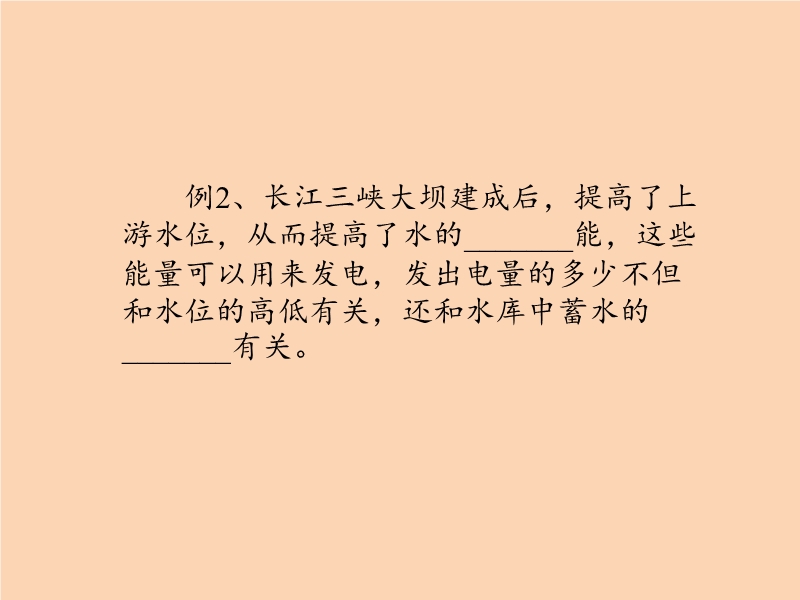 【内容简介】例1、小丽同学在蹦床上运动,她从高处落下后又被弹起的过程中,下列说法正确的是( )A.蹦床形变最大时,小丽的重力势能最小B.蹦床形变最大时,蹦床的弹性势能最小C.小丽从最高点下落过程中,她的动能和重力势能均不断增加D.小丽被弹起后上升过程中,重力势能转化为动能【解析】小丽降低到最低点时,蹦床形变最大,小丽的重力势能最小,故A正确;在弹性限度内,弹性形变越大,物体具有的弹性势能越大,所以蹦床形变最大时,蹦床的弹性势能最大,故B错误;小丽从最高点下落过程中,重力势能不断减小,故C错误;小丽被弹起后上升过程中,其质量不变,速度变小,高度增加,动能转化为重力势能,故D错误。【答案】A 例2、长江三峡大坝建成后,提高了上游水位,从而提高了水的_______能,这些能量可以用来发电,发出电量的多少不但和水位的高低有关,还和水库中蓄水的_______有关。【解析】重力势能大小的影响因素:质量、高度。质量越大,高度越高,重力势能越大。修拦河大坝是为了提高上游水位,水的质量不变,高度增大,重力势能增大;发出电量的多少不但和水位的高低有关,还和水库中蓄水的质量有关。【答案】重力势质量.........