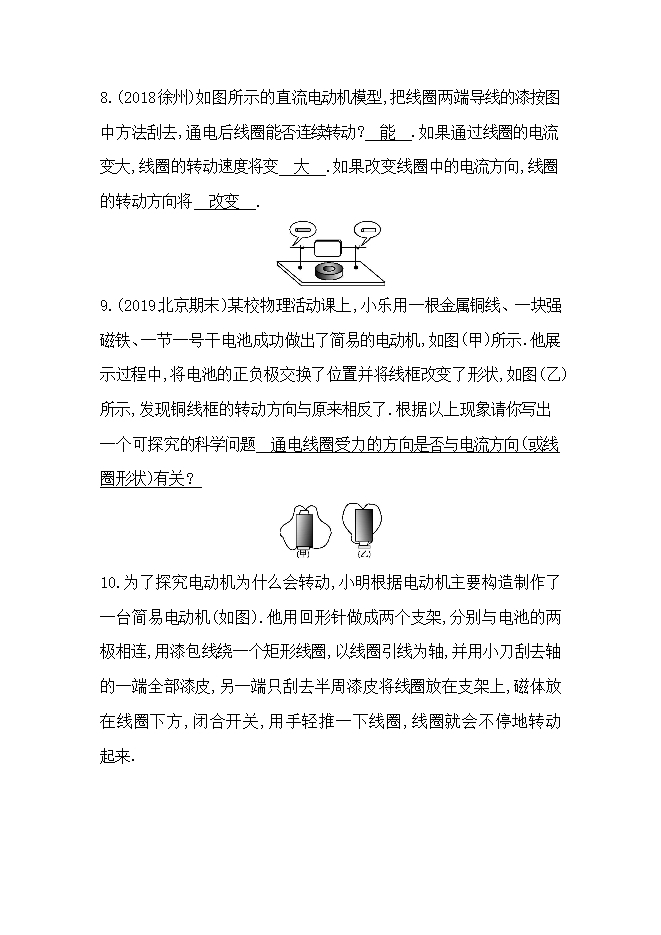 【内容简介】1.了解电动机的结构.2.会观察、拆装简单电动机并结合电动机模型认识电动机的两大组成部分.3.能通过猜想的方法分析电动机转动的原因可能是由于磁场对通电线圈产生力的作用.一、了解电动机的结构电动机的主要部件是 和转子. 二、关于电动机转动的猜想1.对电动机转动的猜想(1)电动机里线圈未通电时不转,通电时转动,据此可以猜想电动机的转动可能与 有关. (2)通电线圈在磁场里转动,在磁场外不转动,据此可以猜想电动机的转动可能与 有关. (3)通电线圈在磁场里能从静止到转动,据此可以猜想,磁场可能对通电线圈产生 而使线圈转动. 2.为验证猜想而对电动机的结构做合理的简化,把线圈简化为导线作为研究对象,便于探究通电线圈受力转动的具体情况.探究点一:电动机的结构及应用想一想:电动机通电后会转动起来,这时将电能转化为机械能,在日常生活中应用十分广泛,观察教材图171,你还能举例说出哪些器具用到电动机吗?........