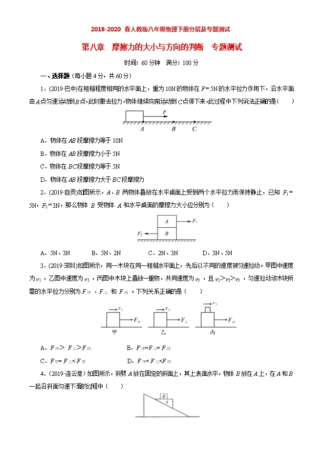2019-2020春人教版八年级物理下册分层及专题测试:第8章 摩擦力的大小与方向的判断(专题测试卷)