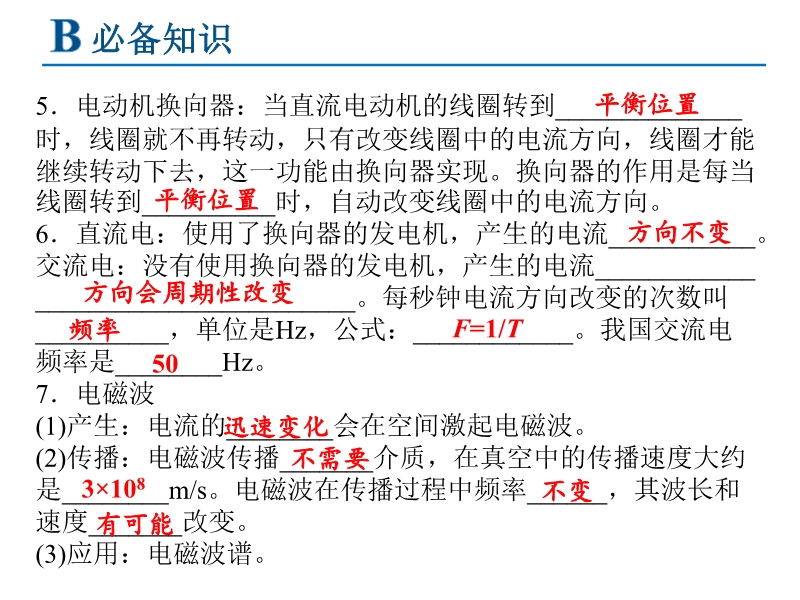 【内容简介】1.磁场 (1)磁性:能够吸引____________等物质的性质。(不能吸引铜、铝、玻璃、塑料) (2)磁场:磁体周围存在着一种物质,能使小磁针偏转,我们把这种物质叫磁场。物理学中把小 磁针静止时______所指的方向定为该点磁场方向。 磁感线的方向是从______出来,回到南极。磁感 线______真实存在。 (3)地磁场:地球周围存在磁场,叫做________。地磁北极在地理______附近,地磁南极在地理 _____附近。地磁南极与地理北极、地磁北极与地理南极并不完全重合,中间有一个夹角,叫做___ ___,是由我国宋代学者__________首先发现。2.电生磁、电动机、磁生电(发电机)3.通电螺线管和电磁铁(1)通电螺线管的周围存在磁场。此磁场与__________的磁场相似,磁场方向与____________有关。(2)通电螺线管和它里面的________就构成了一个电磁铁。电磁铁的磁性强弱与________________和______________有关,通过电流越强,磁性越强;电流一定,匝数越多磁性越强。4.电磁继电器和扬声器:电磁继电器是利用__________、__________电路的通断,间接地控制高电压、强电流的装置。其实质是一个__________。扬声器是把电信号转换成声信号的一种装置。5.电动机换向器:当直流电动机的线圈转到______________时,线圈就不再转动,只有改变线圈中的电流方向,线圈才能继续转动下去,这一功能由换向器实现。换向器的作用是每当线圈转到__________时,自动改变线圈中的电流方向。6.直流电:使用了换向器的发电机,产生的电流___________。交流电:没有使用换向器的发电机,产生的电流____________________________________。每秒钟电流方向改变的次数叫__________,单位是Hz,公式:__________。我国交流电频率是________Hz。7.电磁波(1)产生:电流的________会在空间激起电磁波。(2)传播:电磁波传播_______介质,在真空中的传播速度大约是________m/s。电磁波在传播过程中频率______,其波长和速度_______改变。(3)应用:电磁波谱。.......
