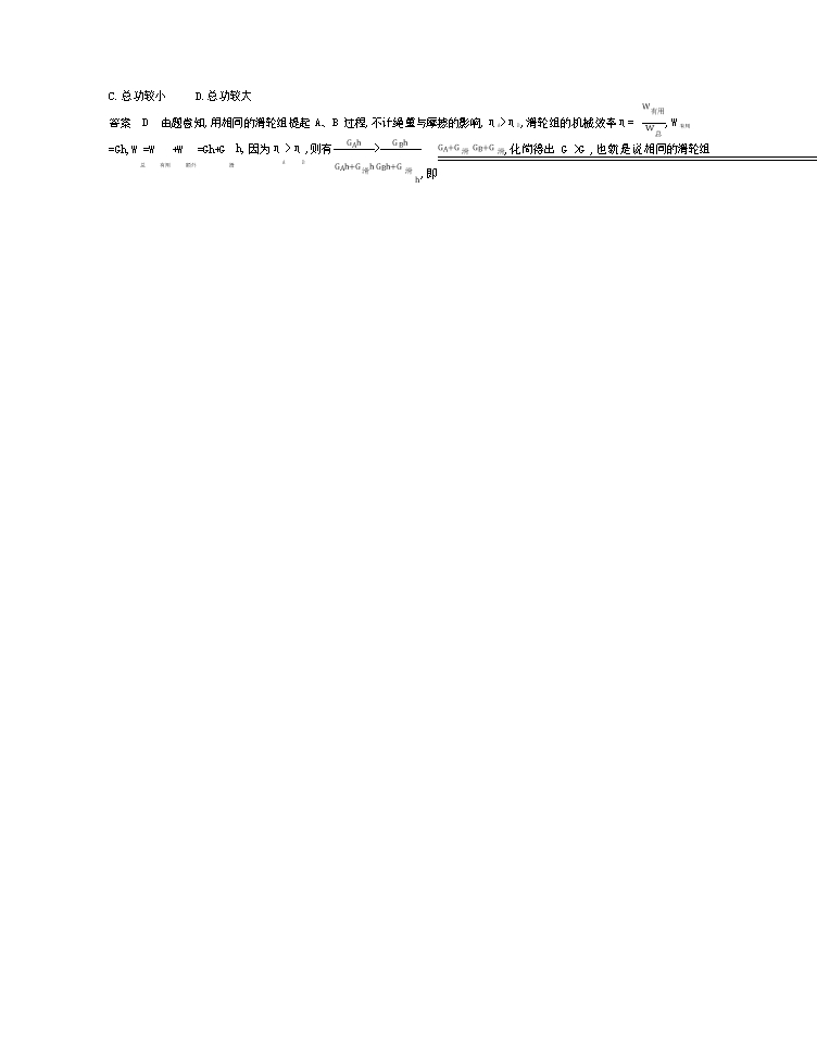 【内容简介】基础闯关全练拓展训练1.(2019 河南中考)如图开瓶器开启瓶盖时可抽象为一杠杆,不计自重。选项图能正确表示它工作示意图的是()答案 B 由图知,起子向上用力时,围绕左端转动,因此支点在左端,又动力的方向向上,使杠杆沿逆时针转动,所以,阻力的方向向下,使杠杆沿顺时针转动,故选 B。2.静止的杠杆在加上一个外力 F 的作用后仍保持静止,那么力 F 的力臂等于 m,此时力的作用线通过 。答案 0 支点解析 杠杆静止,说明杠杆处于平衡状态,加上一个外力 F 的作用后仍保持静止,此时力 F 的作用线通过支点,其力臂为 0m。3.人的前臂可以看成杠杆,如图所示,图中 O 为支点,一人手内握有一个铁球,肱二头肌收缩产生动力可将铁球拿起。在图中画出动力的方向及阻力臂 L2。 答案 如图所示解析 阻力 F2 竖直向下,从支点 O 向阻力的作用线作垂线段,垂线段的长度是力 F2 的力臂,即阻力臂 L2;动力的方向沿肱二头肌收缩的方向,故动力 F1 的方向斜向上。4.(2018 河北模拟)探究杠杆的平衡条件: (1)当杠杆静止在图甲所示的位置时,杠杆处于 (选填“平衡”或“不平衡”)状态;如图甲中,应将右端的平衡螺母向 (选填“左”或“右”)调节使杠杆在水平位置平衡,这样做是为了 ;(2)小明同学用图乙所示的方法使杠杆处于平衡状态,测出此时的拉力大小为 F1,发现,F1L1≠F2L2,其原因是: 。答案 (1)平衡 右 便于测量力臂大小 (2)F1 的力臂测量错误解析 (1)杠杆静止时处于平衡状态;图甲中,杠杆右高左低,应将右端的平衡螺母向右调节,使杠杆在水平位置平衡,这样便于测量力臂大小。(2)图中,拉力 F1 的方向与水平杠杆不垂直,只有力的方向与杠杆垂直时,力臂才能从杠杆上直接读出来,小明误把图中L1 当成了拉力的力臂,所以会出现 F1L1≠F2L2。能力提升全练拓展训练1.(2019 山东临沂平邑一模)如图所示,用刻度均匀的匀质杠杆进行“杠杆平衡条件”的实验(每个钩码重相等),下列说法正确的是()A.实验前出现图中所示情况,应将杠杆的平衡螺母向左调 B.在 AB 处各减少一个钩码,杠杆仍然能保持平衡C.实验时,在 C 处挂 5 个钩码,再向左移动平衡螺母调节杠杆平衡 D.弹簧测力计由竖直方向逐渐向右转动,杠杆始终保持水平平衡,则弹簧测力计的示数将逐渐变大答案 D 杠杆左端下沉,说明杠杆“左重右轻”,应将平衡螺母向右调节,A 错误;杠杆的平衡条件为“动力×动力臂=阻力×阻力臂”,由图可知,3G×2L=2G×3L, A、B 处各减少一个钩码,2G×2L>G×3L,B 错误;实验开始后,不可调节平衡螺母,C 错误;弹簧测力计由竖直方向逐渐向右转动,动力臂逐渐变短,由于阻力和阻力臂不变,则弹簧测力计的示数逐渐变大,D 正确。2.列车上有出售食品的手推车(如图所示)。若货物在车内摆放均匀,当前轮遇到障碍物时,售货员向下按扶把,这时手推车可以视为 杠杆,支点是 ;当后轮遇到障碍物时,售货员向上提扶把,这时支点是 ,手推车可以视为 杠杆。 .........