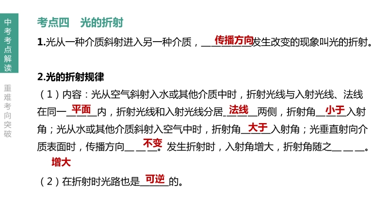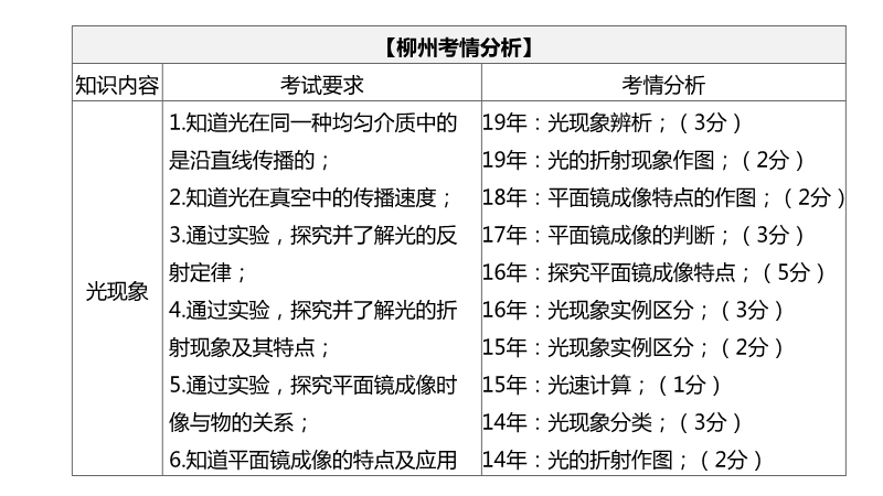 【内容简介】【柳州考情分析】1.知道光在同一种均匀介质中的是沿直线传播的;2.知道光在真空中的传播速度;3.通过实验,探究并了解光的反射定律;4.通过实验,探究并了解光的折射现象及其特点;5.通过实验,探究平面镜成像时像与物的关系;6.知道平面镜成像的特点及应用考点一 光的传播1.光源:能 的物体叫光源,太阳、开亮的电灯、点燃的蜡烛都是光源。 2.光在 介质中沿直线传播,用 来表示光的传播路径和方向。光的直线传播现象及应用举例:日食和月食、小孔成像(成倒立的实像)、凿壁偷光、林中影、手影、激光准直、站队、三点一线瞄准、树阴下的光斑(太阳的实像)等。 3.光速:光在 内传播的距离称为光速,光在 中的传播速度最大,光在其他介质中的传播速度都比在真空中 ,光在空气中的传播速度十分接近光在真空中的传播速度。在我们的计算中,真空中的光速大小近似取为c= m/s= km/s,水中的光速约为 c,玻璃中的光速约为 c。 4.色散现象:太阳光通过三棱镜能分解成 、 、黄、绿、蓝、靛、紫七种色光的现象叫光的色散,其中的 、 、 三种色光叫光的三基色。 5.光在真空中传播一年通过的距离叫1光年。光年是 单位,不是时间单位。1光年=9.46×1015 m。 考点二 探究光的反射规律1.反射现象:光射到两种介质的 时,在界面处被反射回原介质中的现象。 2.光的反射定律(1)内容:光反射时,反射光线与入射光线、法线在 内;反射光线和入射光线分居 的两侧;反射角 入射角。 (2)光反射时光路是 的。 3.反射类型:物体对光的反射分 和 两类。我们从不同方向都能看到物体是由于 的缘故。 4.光的反射的重要应用:红宝石激光器和光纤,它们都是利用 传输信息的。 ......