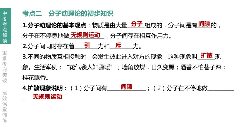 【内容简介】【柳州考情分析】1.知道常见的物质是由分子和原子构成的;2.通过自然界和生活中的一些简单热现象,了解分子热运动的一些特点;3.知道分子动理论的基本观点;4.知道原子是由原子核和电子构成的;5.了解原子的核式模型;6.了解人类探索微观世界的历程,关注人类探索微观世界的新进展;7.了解人类探索太阳系及宇宙的历程,知道对宇宙的探索将不断深入,关注探索宇宙的一些重大活动;8.了解物质世界从微观到宏观的大致尺度考点一 认识分子1.概念:分子是能保持物质 的最小微粒,1811年,意大利物理学家阿伏伽德罗首先把这种微粒叫分子。 2. 大小:分子很小,其直径的数量级为 m,即 nm,分子的质量也很小,一个水分子的质量约为3×10-26 kg。 考点二 分子动理论的初步知识1.分子动理论的基本观点:物质是由大量 组成的,分子间是有 的,分子在不停息地做 ,分子间存在相互作用力。 2.分子间同时存在着 力和 力。 3.不同的物质互相接触时,会发生彼此进入对方的现象,这种现象叫 现象。生活举例:“花气袭人知骤暖”;墙角放煤,日久变黑;酒香不怕巷子深;桂花飘香。 4.扩散现象说明:(1)分子间有 ;(2)分子在不停地做 。 5.扩散现象既可以在 之间发生,还可以在 之间发生,也能够在 之间发生。 6.物质中分子的运动情况跟 有关,温度越高,分子的无规则运动越 。物理学中,将大量分子的无规则运动叫分子的 。......