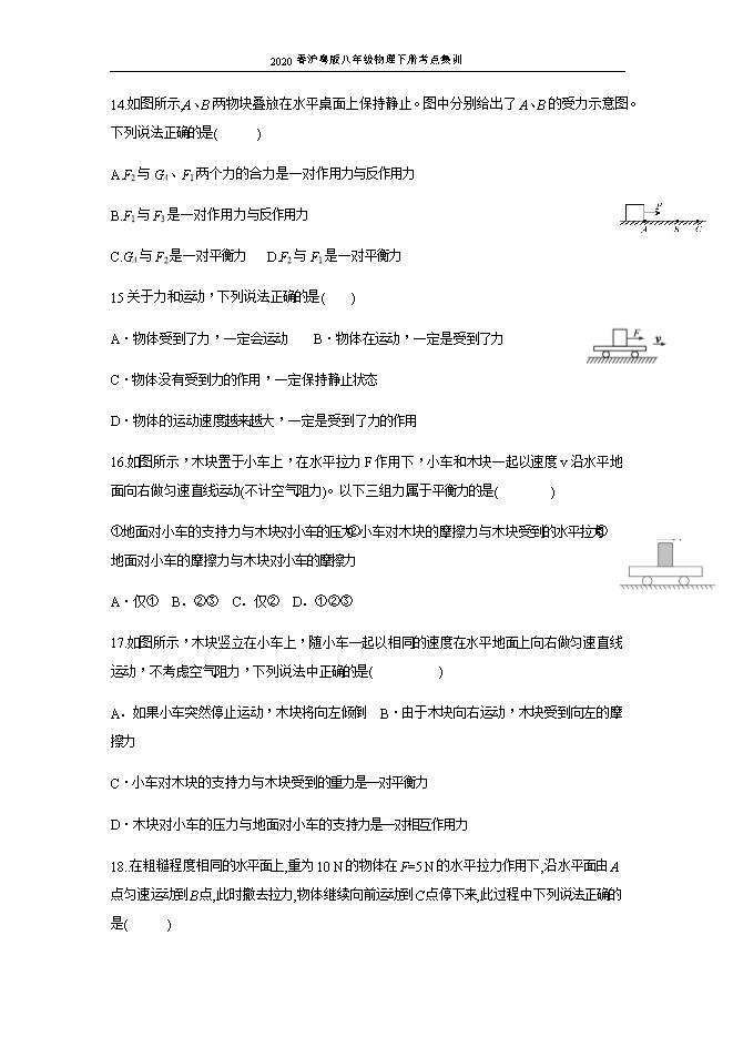 2020春沪粤版八年级物理下册考点集训:7.4 探究物体受力时怎样运动(附答案)