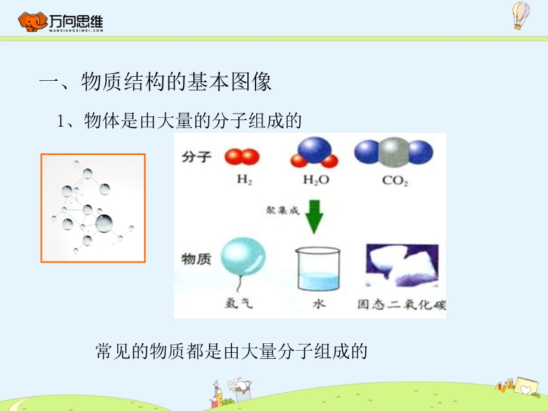 【内容简介】一、物质结构的基本图像1、物体是由大量的分子组成的2、分子在不停息地做无规则运动两种不同的物质可以自发地彼此进入对方,这种现象称为扩散现象。组成物质的分子处于永不停息的无规则运动之中。温度越高,分子的运动越剧烈。我们称这种运动为热运动。3、分子间的作用力分子间同时存在引力和斥力。二、物体的内能1.构成物体的所有分子,其热运动的动能与分子势能的总和,叫做物体的内能。内能的单位是焦耳(J)。机械能与整个物体的机械运动情况有关,内能与物体内部分子的热运动和分子间的相互作用情况有关,所以内能是不同于机械能的另一种形式的能。因为所有的物体的分子都在不停地做无规则运动,所以一切物体都具有内能。2.内能的改变内能的大小与 和 有关, 越高, 越大,物体的内能就越大。.........