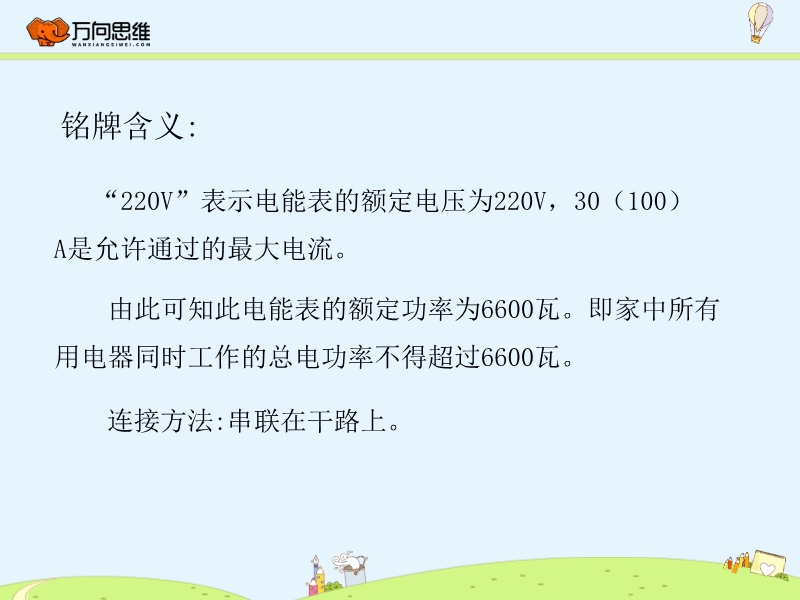 【内容简介】家庭电路中的两根电线,一根叫火线,另一根叫零线。火线和零线之间有220 伏的电压,零线和地之间没有电压。家庭电路的组成电能表作用:测量用户在一定时间内消耗多少电能。铭牌含义:“220V”表示电能表的额定电压为220V,30(100)A是允许通过的最大电流。 由此可知此电能表的额定功率为6600瓦。即家中所有用电器同时工作的总电功率不得超过6600瓦。........
