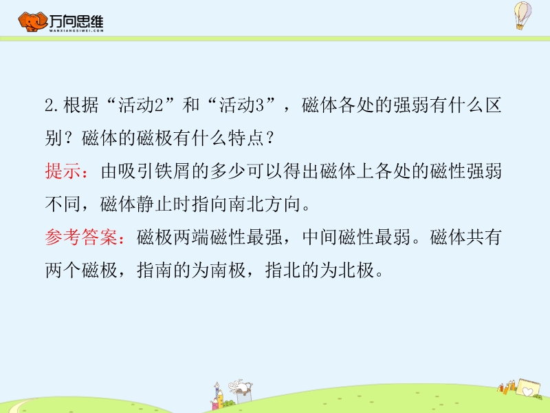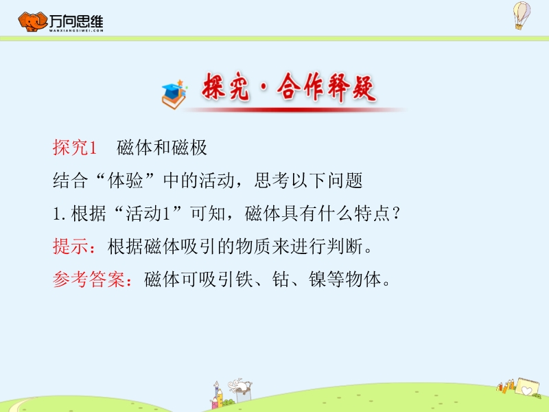 【内容简介】体验 认识磁体和磁性活动1:准备铁钉(软铁)、纸屑、大头针、铝片、铜片、小磁针、玻璃、一元硬币(镍),用磁体分别靠近;活动2:将一根条形磁体放入一堆铁屑中,然后取出并抖动;活动3:将一根条形磁体挂起来使它水平自由转动,最终静止;活动4:将一个大铁钉(软铁)吸在磁体上后吸引小铁钉。(1)活动1中,磁体能吸引的物体是___________________ 。(2)活动2中,磁体两端吸引铁屑比中间部分吸引的铁屑______(选填“多”或“少”)。(3)活动3中,条形磁体最终静止时指向 方向。(4)活动4中,吸引在磁体上的大铁钉(软铁) 吸引小铁钉,大铁钉(软铁)与磁体分离,大铁钉(软铁) 吸引小铁钉。(均选填“能”或“不能”)提示:(1)铁钉、大头针、小磁针、一元硬币 (2)多 (3)南北 (4)能 不能探究1 磁体和磁极结合“体验”中的活动,思考以下问题1.根据“活动1”可知,磁体具有什么特点?提示:根据磁体吸引的物质来进行判断。参考答案:磁体可吸引铁、钴、镍等物体。2.根据“活动2”和“活动3”,磁体各处的强弱有什么区别?磁体的磁极有什么特点? 提示:由吸引铁屑的多少可以得出磁体上各处的磁性强弱不同,磁体静止时指向南北方向。参考答案:磁极两端磁性最强,中间磁性最弱。磁体共有两个磁极,指南的为南极,指北的为北极。.......