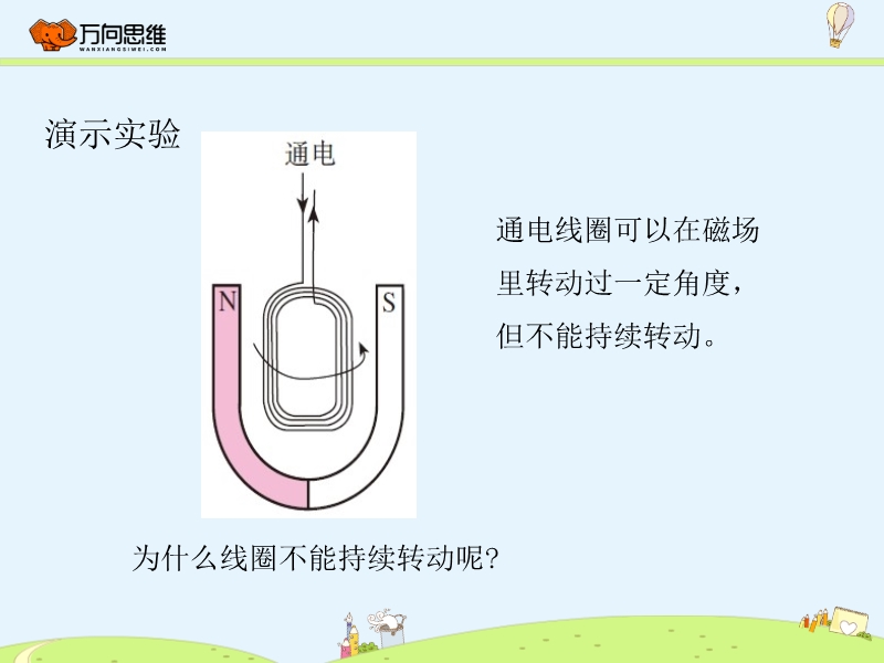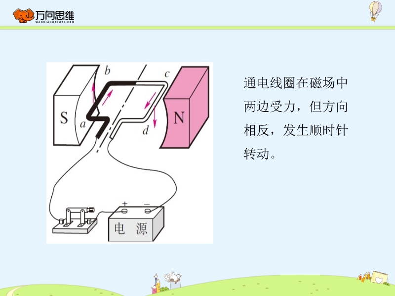 【内容简介】通电线圈可以在磁场里转动过一定角度,但不能持续转动。通电线圈在磁场中两边受力,但方向相反,发生顺时针转动。当线圈的平面与磁场垂直时,通电线圈受平衡力作用,达到平衡位置。这时由于惯性,线圈还会继续转动。线圈靠惯性越过平衡位置后,磁场力作用的结果使线圈逆时针旋转。如果在线圈越过平衡位置后停止对线圈供电,由于惯性,线圈继续转动。转动半周后再继续供电,线圈不就可以持续转下去了吗?1.电动机的基本构造电动机由两部分组成:能够转动的线圈,也叫转子;固定不动的磁体,也叫定子。想一想:如果在线圈转动的后半周,不是停止给线圈供电,而是设法改变后半周的电流方向,使线圈在后半周也获得动力,线圈不就能转得更平稳了吗?2.换向器通过换向器可以使线圈中电流每半周改变一次。.......