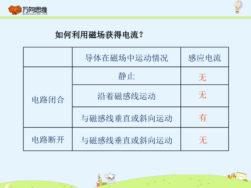 【内容简介】实验:观察“磁生电”现象1.观察微型电扇的结构2.在微型电扇的插头处接一只发光二极管,用手旋转叶片,发现了什么?3.如果用手指捏紧插头的两极,旋转叶片,有什么感觉?英国物理学家法拉第从1822年起,经过十年的努力,终于在1831年发现了磁也能生电。利用磁场产生电流的现象叫做电磁感应;电磁感应产生的电流叫做感应电流。探究感应电流产生的条件_______电路的_________导体在___中做__________的运动时,导体中会产生感应电流。.....