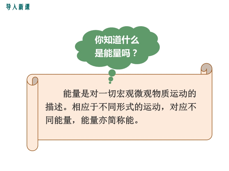 【内容简介】能量是对一切宏观微观物质运动的描述。相应于不同形式的运动,对应不同能量,能量亦简称能。一、形形色色的能1.常见的能量:机械能、内能、电能、光能,电磁能、化学能、原子能、生物能、太阳能等。2.讨论交流:物体具有的能量 在空中运动的皮球具有机械能,一缕阳光具有太阳能,太阳能是由太阳内部氢原子发生聚变释放出巨大核能而产生的能,来自太阳的辐射能量。 在空中运动的皮球具有机械能,一缕阳光具有太阳能,太阳能是由太阳内部氢原子发生聚变释放出巨大核能而产生的能,来自太阳的辐射能量。 皮球从空中落向地面时,皮球的势能转化为它的动能;将电池接人电路中,电池储存的化学能便转化为了电能。同时电灯发出光和热,电能转化为光能和内能。