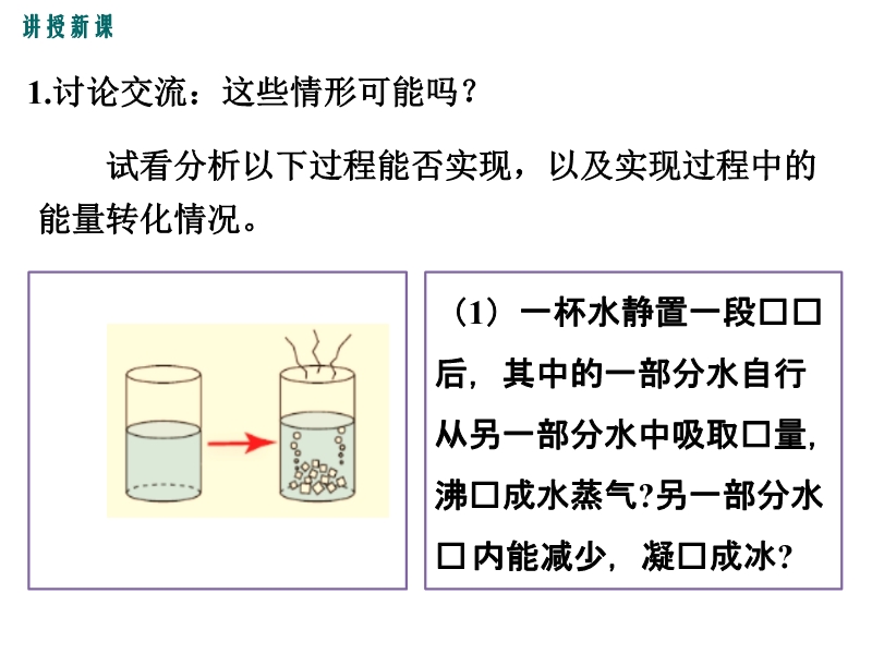 【内容简介】能量的转化和转移无处不在。然而,许多情况虽然并不违背能量守恒定律,但在实际情形中却不会发生,这是为什么呢?这是因为能量的转化具有方向性一、能量转化的方向性思考:水能从低处往高处流吗?水能自发地从低处往高处流吗?如果水是自发地流只能从高处往低处流,同样能量的自发流向也不是随意的,即能量的转化具有方向性。热传递的过程是有方向性的,这个过程可以向一个方向自发地进行,但是向相反的方向却不能自发地进行。注意:内能总是自发地从高温物体向低温物体转移而不会自发地由低温物体向高温物体转移。2.能量流动具有方向性(1)转移的方向性 热量只能自发地从高温物体转移到低温物体,反之要想使热量自发地从低温物体流入高温物体是不可能的。但如果有外界适当的干预,或满足一定的条件,热量可以从低温物体转移至高温物体。例如空调可以将热量从低温的室内移至高温的室外,但外界必须做功,这种转移才是可能的,空调不开不做电功,这种转移就是不可能的。.........