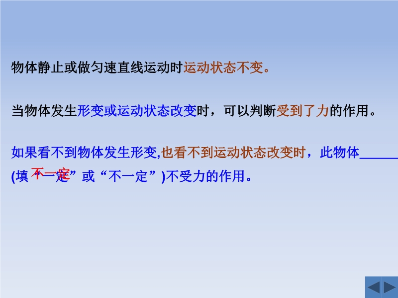 【内容简介】力是一个物体对另一个物体的作用怎样判断物体受到力的的作用?排球运动员击球,排球的 发生了改变,这是因为排球受到 的作用。当物体发生形变或运动状态改变时,可以判断受到了力的作用。 物体由静到动,由动到静,由慢到快,由快到慢,或运动方向发生改变,都叫做运动状态改变。 手指压铅笔时,手指有什么感觉?手指感觉疼痛是因为手指受到了铅笔的作用力说明力的作用是相互的