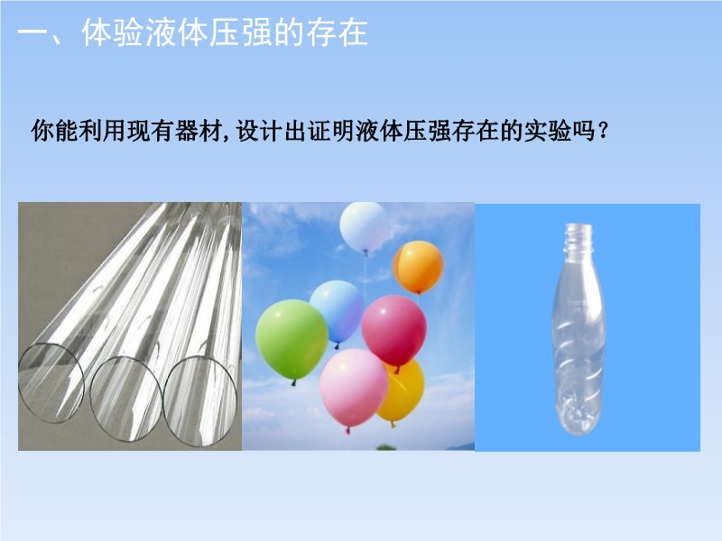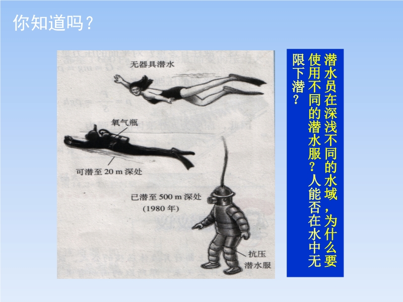 【内容简介】潜水员在深浅不同的水域,为什么要使用不同的潜水服?人能否在水中无限下潜?带鱼生活在深海中,为什么我们在鱼市上却看不到活带鱼?一、体验液体压强的存在液体受重力作用对容器底有压强液体能流动,对容器壁也有压强液体内部向各个方向都有压强。液体压强的特点:1.液体对容器底部有压强;2.液体对容器侧壁也有压强;3.液体内部有压强。可见,液体内部各个方向都有压强。那么液体内部的压强有什么特点呢?压强计的原理:当金属盒上的橡皮膜受到压强时,U形管两边的液面出现高度差;压强越大,液面的高度差也越大。液体内部向各个方向都有压强。在同一深度,液体向各个方向的压强相等。液体内部压强的规律1、液体内部压强的大小,随深度的增加而增大;2、在同一深度处,液体向各个方向的压强大小相等;3、在不同液体的同一深度,液体的密度越大,压强越大。........