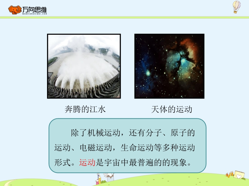【内容简介】我们根据什么说这些物体是运动的?一、运动的描述1、在物理学中,我们把物体位置的变化叫做机械运动除了机械运动,还有分子、原子的运动、电磁运动,生命运动等多种运动形式。运动是宇宙中最普遍的的现象。二、参照物:1.参照物:判断物体是运动和静止时,被选作标准的物体叫做参照物。2.观察研究对象相对于参照物之间的位置(距离或方向)上是否变化。3.运动的物体和静止的物体都可以作为参照物。通常情况下,选择地面或固定在地面上的物体作为参照物,在这种情况下,参照物可略去不提。运用参照物判断物体的运动情况,具体方法如下:① 确定研究对象,即明确要判断哪个物体是否运动;②选定参照物;③看被研究的对象相对于参照物的位置是否发生变化,若位置有变化,则被研究的物体是运动的,若位置无变化,则被研究的物体是静止的。物体的运动和静止是相对的三、运动和静止的相对性