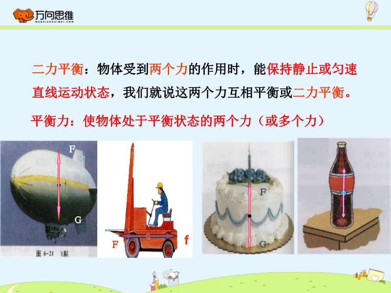 【内容简介】惯性定律的内容是什么?那么物体受到力的作用时,它的运动状态一定改变吗? 二力平衡:物体受到两个力的作用时,能保持静止或匀速直线运动状态,我们就说这两个力互相平衡或二力平衡。平衡力:使物体处于平衡状态的两个力(或多个力)活动一:探究二力平衡的条件实验步骤:1、两盘中砝码的质量相等;2、两盘中砝码的质量不相等;3、两盘中砝码的质量相等,将小车在水平桌面上扭转一个小角度后释放。观察:小车的运动情况(运动、静止)、受力情况(水平方向上所受力的大小、方向、作用点)5.归纳结论:二力平衡的条件是:活动三:观察物体受非平衡力作用时怎样运动